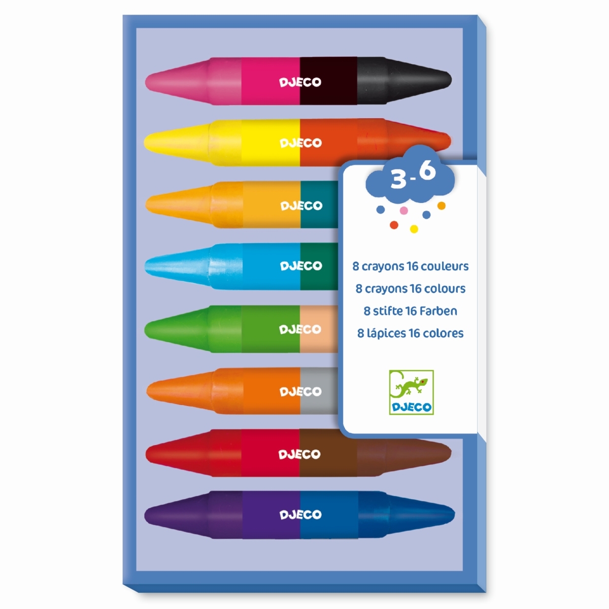 Jetzt wird’s bunt! Mit den 8 doppelseitigen Wachsmalkreiden von Djeco stehen 16 Farben zur Verfügung, mit denen kleine Kunstwerke entstehen! Die Wachsmalkreiden sind kurz und dick und liegen gut in den Händen der Kleinsten. Leuchtende Farben und widerstandsfähige Minen – perfekt für kleine Kreative ab 3 Jahren..