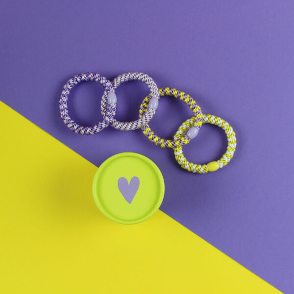 Haargummi-Set gelb/flieder mit 4 Haargummis in runder Geschenkbox