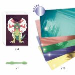 Inhalt: 4 illustrierte Karten (15 x 21 cm) mit vorbereiteten Klebeflächen, 15 Metallfolien (Gold, Blau, Parma, Grün, Bronze, Violett, Granat), 1 Werkzeug aus Kunststoff zum Freilegen der Klebeflächen, 1 Schritt-für-Schritt-Anleitung in Farbe.