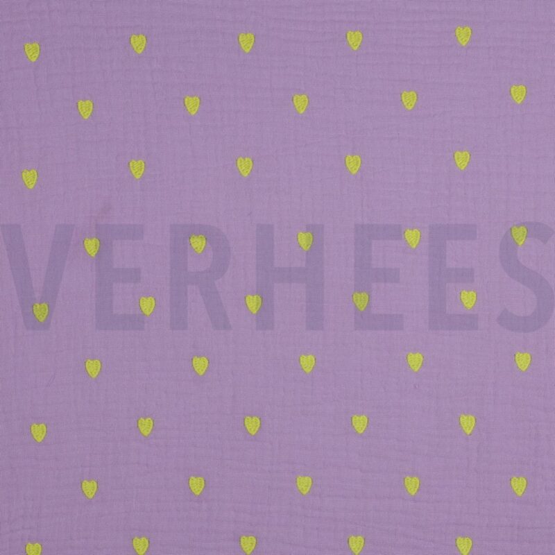 Dieser luftige Double Gauze Stoff in Flieder/Neon mit Herzen-Motiv ist ein Liebling für Babys und Kinder. Die doppellagige Musselin-Webart macht ihn besonders weich und hautfreundlich – ideal für Schlafsäcke, Babydecken, Swaddles, leichte Sommerkleider und Kinderpyjamas. Er wird mit jedem Waschen noch weicher.