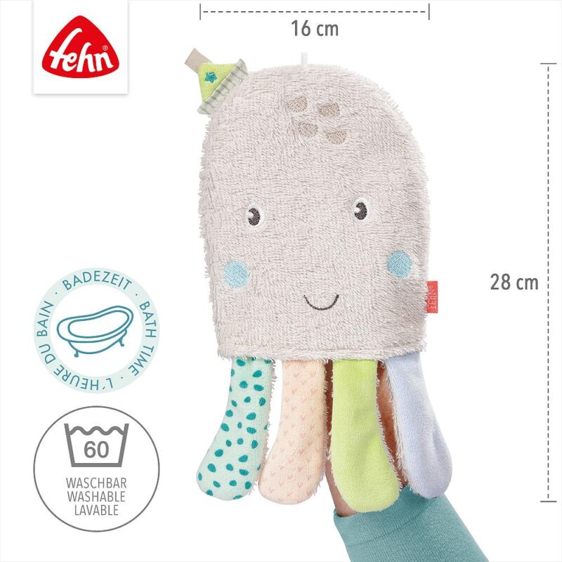 Mache das Baden deines Babys zum fröhlichen Erlebnis mit unserem Waschlappen im Tiermotiv – der süße Oktopus sorgt mit seinen sanften Farben und weichem Material für großen Badespaß. Der kleine Helfer ist vielseitig einsetzbar: Zum Baden, als Handpuppe zum Spielen oder zum sanften Reinigen. Der weich geraute Handtuchfrottee ist besonders schonend zur empfindlichen Babyhaut und zaubert ein glückliches Lächeln ins Gesicht. Mit süßen Details und einer schönen Farbe ist der Koala auch als Trockentier im Badezimmer ein niedlicher Blickfang.