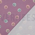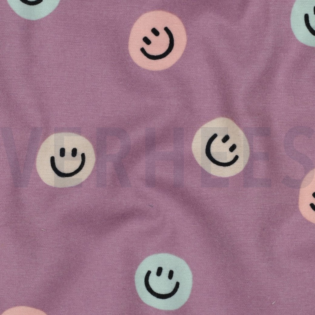 Flanell in Flieder mit fröhlichem Happy Faces Motiv – weich, warm und perfekt für Herbst- und Winterprojekte. Das leicht angeraute Material ist angenehm auf der Haut und ideal für Pyjamas, Decken, Hemden und kuschelige Kinderkleidung.