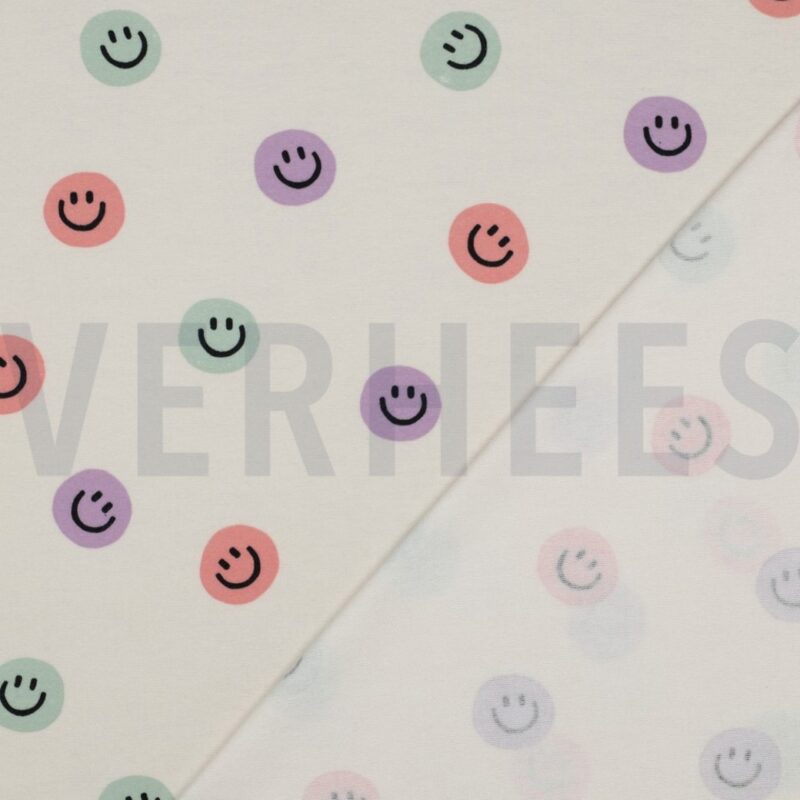 Flanell in Off-White/Flieder mit fröhlichem Happy Faces Motiv – weich, warm und perfekt für Herbst- und Winterprojekte. Das leicht angeraute Material ist angenehm auf der Haut und ideal für Pyjamas, Decken, Hemden und kuschelige Kinderkleidung.