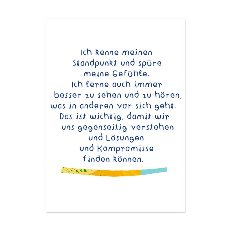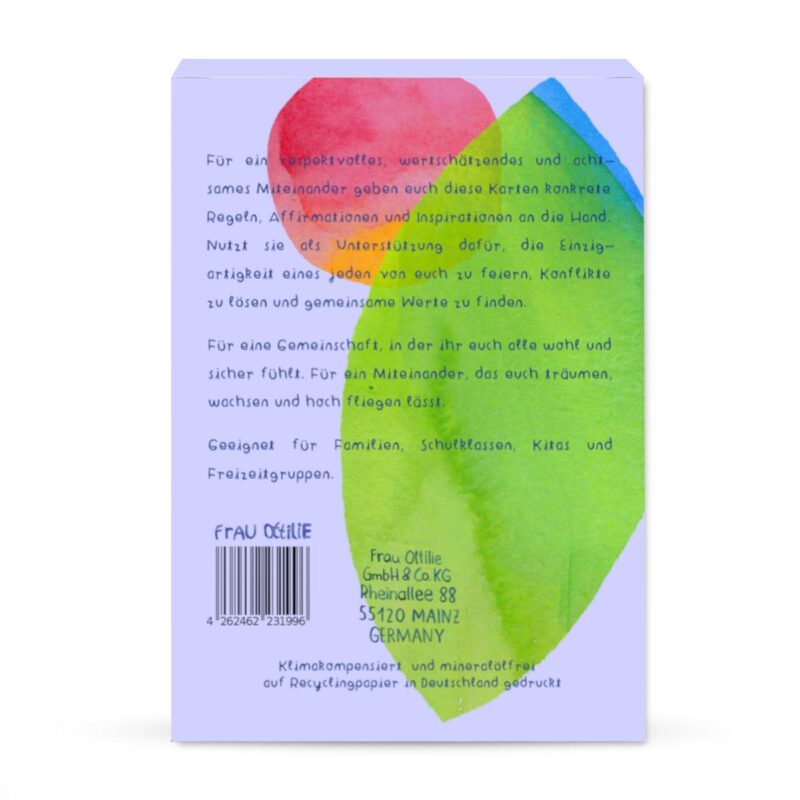 Qualität: stabiler Karton zur Aufbewahrung I handliche DINA 6 Karten I 350g Papier Umwelt: 100% Recyclingpapier I mineralölfreie Biofarbe I klimakompensiert in Deutschland hergestellt Für ein respektvolles, wertschätzendes und achtsames Miteinander geben euch diese Karten konkrete Regeln, Affirmationen und Inspirationen an die Hand. Nutzt sie als Unterstützung dafür, die Einzigartigkeit eines jeden von euch zu feiern, Konflikte zu lösen und gemeinsame Werte zu finden. Für eine Gemeinschaft, in der ihr euch alle wohl und sicher fühlt. Für ein Miteinander, das euch träumen, wachsen und hoch fliegen lässt.