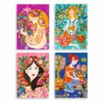 Das Kreativ-Set beinhaltet 4 Motivvorlagen und 6 Röhrchen mit Glitzersand in unterschiedlichen Farben, Schritt-für-Schritt-Anleitung, sowie Pinsel und Spatel.