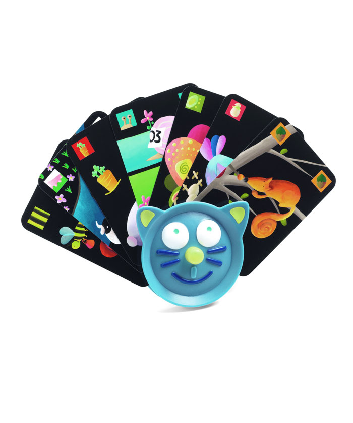 Ein lustiger katzenförmiger Kartenhalter von Djeco für kleine Kinder ab 3 Jahren. Er unterstützt kleine Kinderhände, Spielkarten zu halten und sie leichter zu sehen.