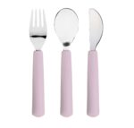 Das Set aus Messer, Gabel und Löffel ist aus rostfreiem Edelstahl mit Griffen aus Silikon. Das Besondere daran: die Griffe sind ergonomisch geformt, sodass sie das Greifen und Halten unterstützen. Perfekt also für die ersten Essversuche.