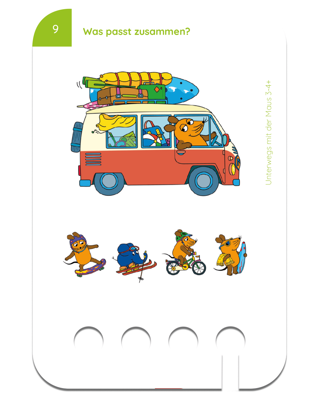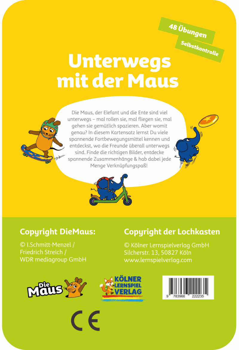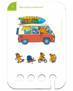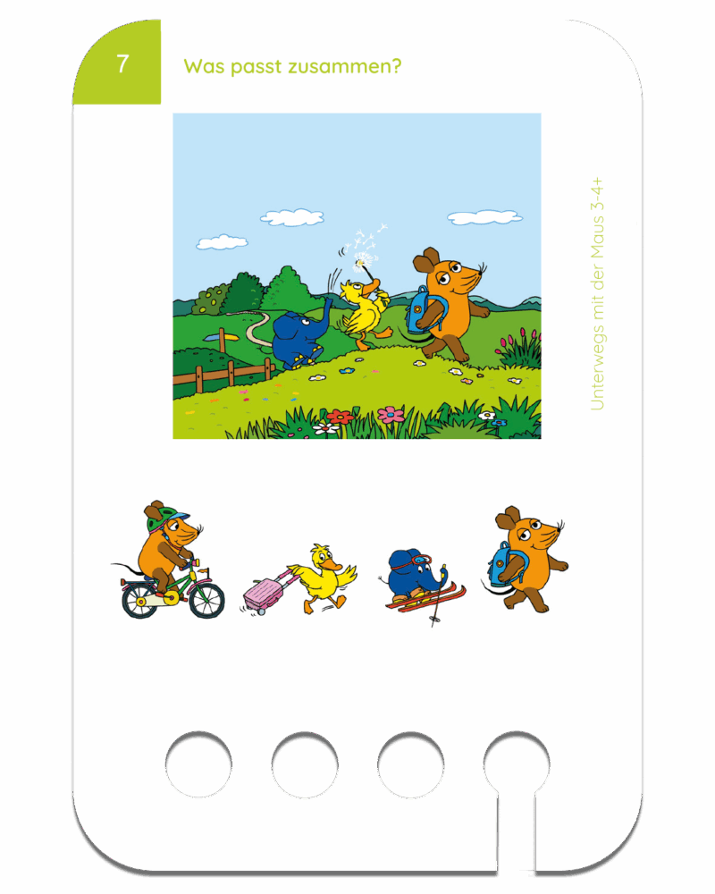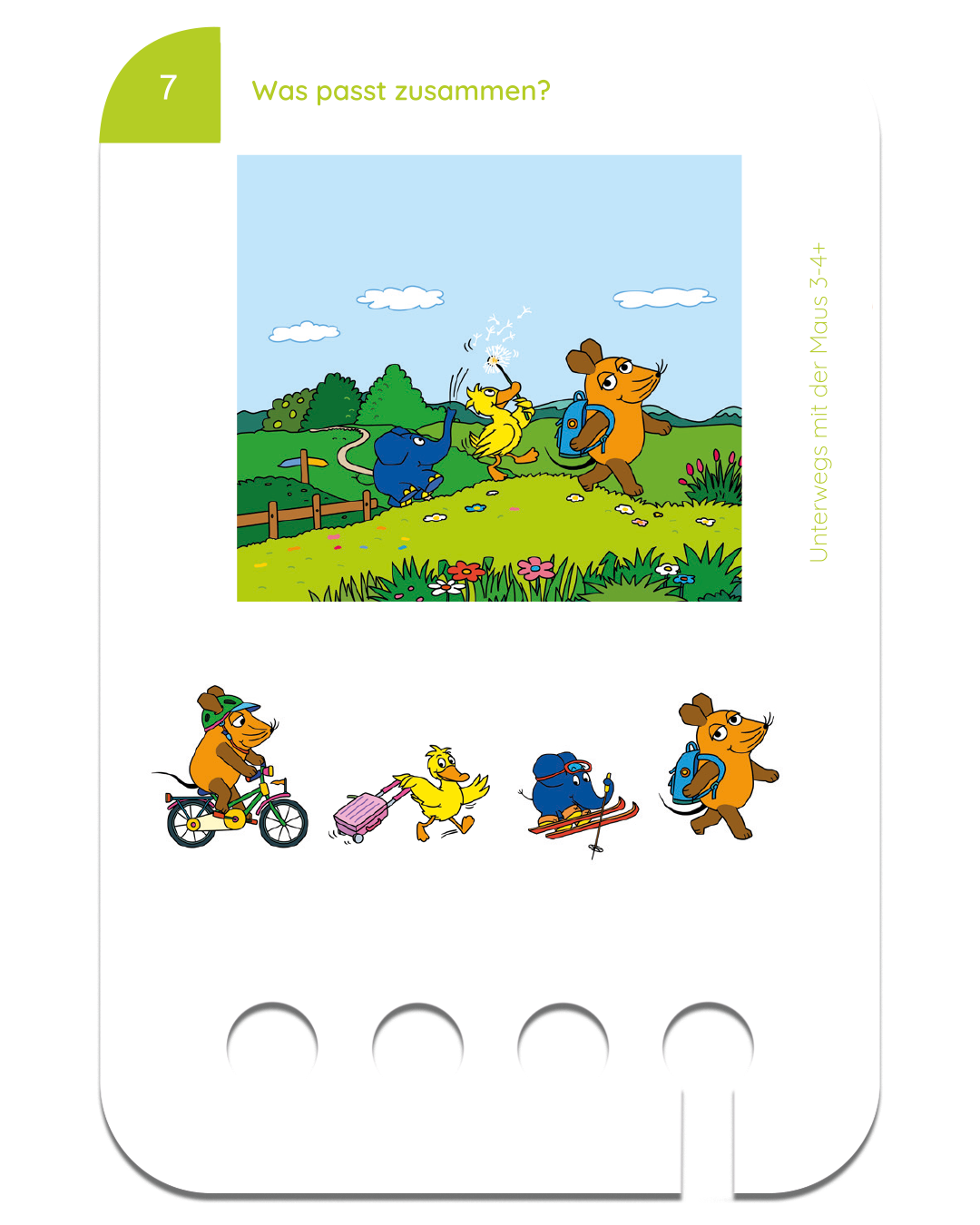 Die Maus, der Elefant und die Ente sind viel unterwegs – mal rollen sie, mal fliegen sie, mal gehen sie gemütlich spazieren. Aber womit genau? In diesem Kartensatz lernst Du viele spannende Fortbewegungsmittel kennen und entdeckst, wo die Freunde überall unterwegs sind. Finde die richtigen Bilder, entdecke spannende Zusammenhänge & hab dabei jede Menge Verknüpfungsspaß! Dieser Kartensatz fördert die visuelle Wahrnehmung, die Konzentration und das logische Denken. Gleichzeitig erweitern Kinder ihr Alltagswissen, lernen verschiedene Fortbewegungsmittel kennen und stärken ihre Sprachentwicklung, indem sie die passenden Bilder entdecken und benennen
