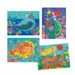 Dieses Mosaik-Einsteiger-Set von Djeco  führt die Kinder in das Herz des Dschungels. 4 Bilder, die mit kleinen Metallic-Mosaiksteinen aus Schaumstoff und Glitzersteinen, die wie Sticker verwendet werden, vervollständigt werden. Das Kind sucht die Zahlen und klebt die entsprechenden Steine dann auf den dafür vorgesehenen Platz auf dem Bogen. Es entstehen wundervolle Bilder und die Meerjungfrauen funkeln im Spiegel der Wellen.