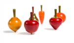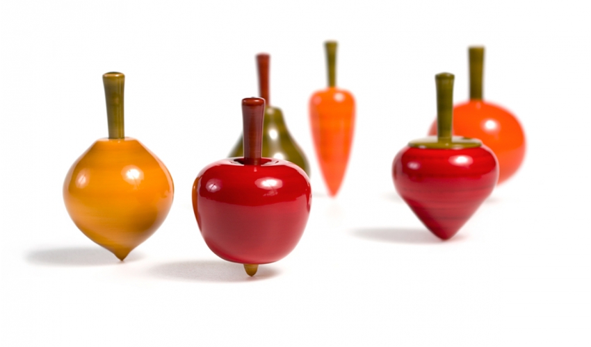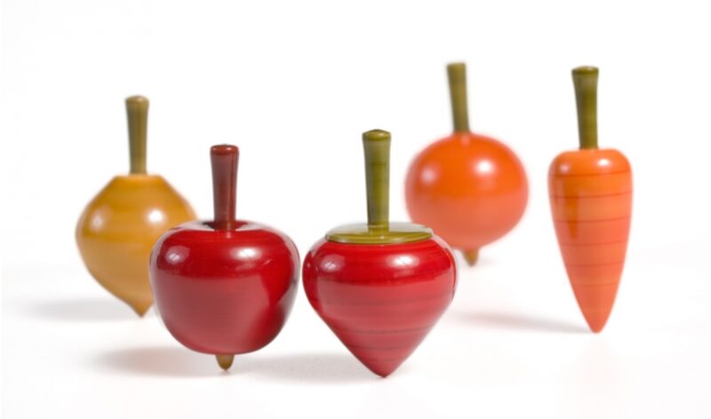 Vitaminspielzeug für jedermann. Hergestellt aus Holz und lackiert in sehr leuchtenden, pflanzlichen Farben. Hui, wie die sich drehen und drehen und drehen…