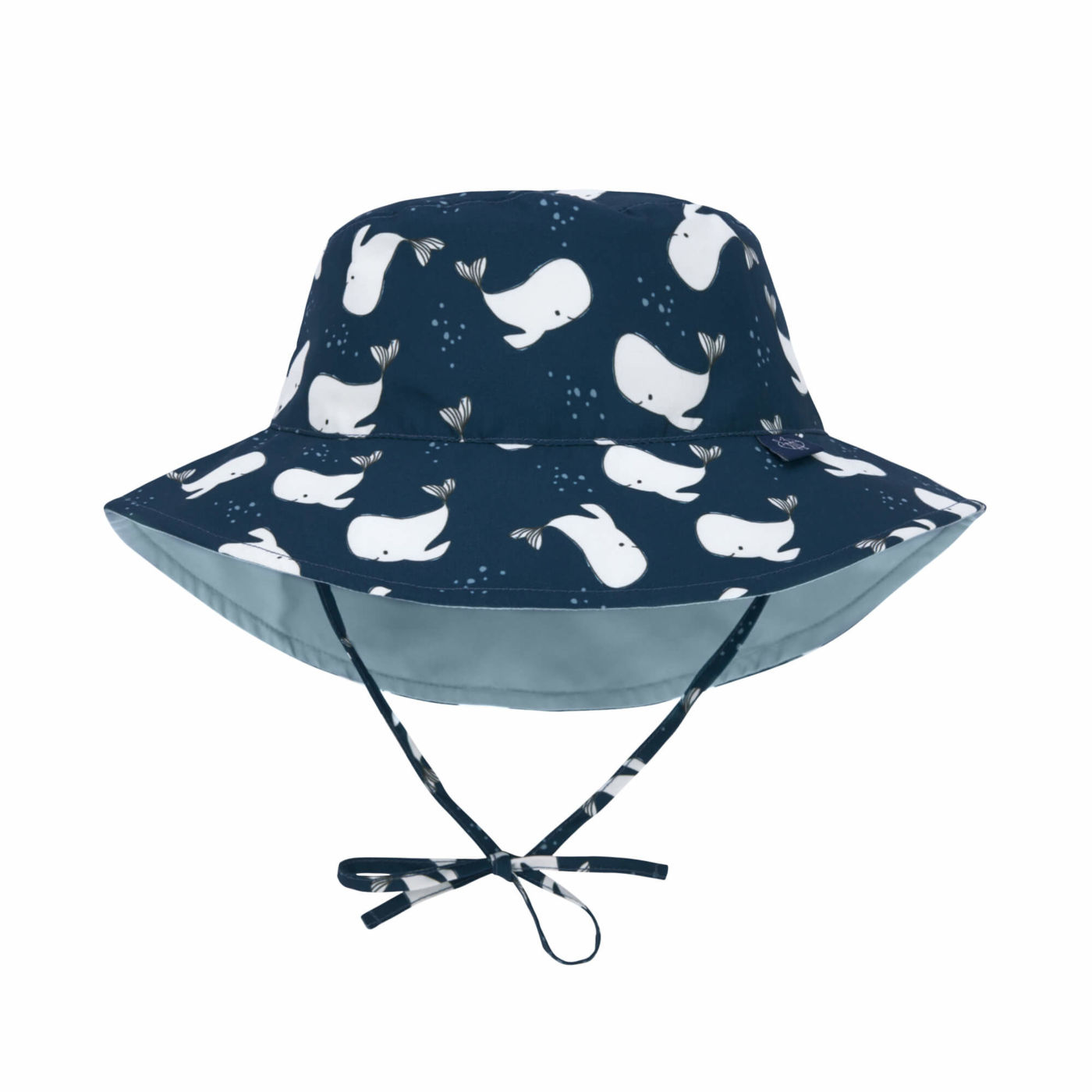 Der verspielte Sonnenhut mit den freundlichen Meeresriesen von LÄSSIG  sorgt nicht nur für gute Laune, sondern schützt auch empfindliche Kopfhaut mit UV-Schutz 80. Der Wende-Sonnenhut hat eine gemusterte Seite mit drolligen Walen und eine unifarbene Seite in Blaugrau – trag ihn, wie du es magst! Und damit der Sonnenhut auch bei Wind oder beim Toben nicht verloren geht, lässt er sich unter dem Kinn binden.