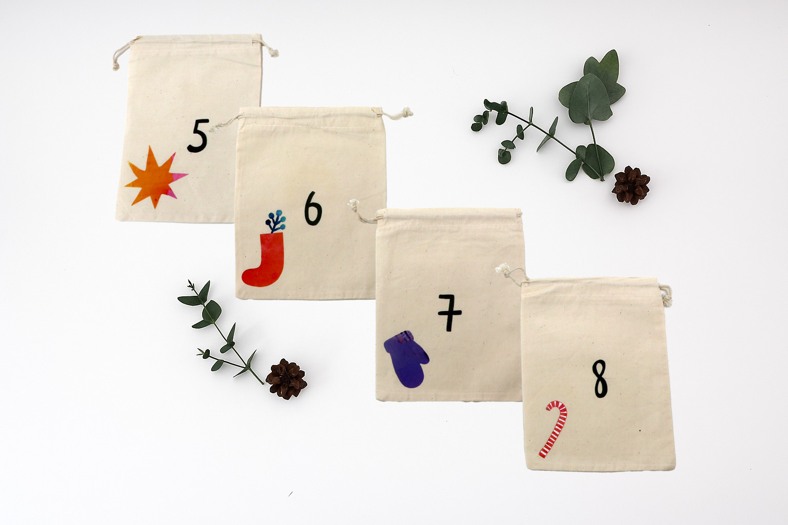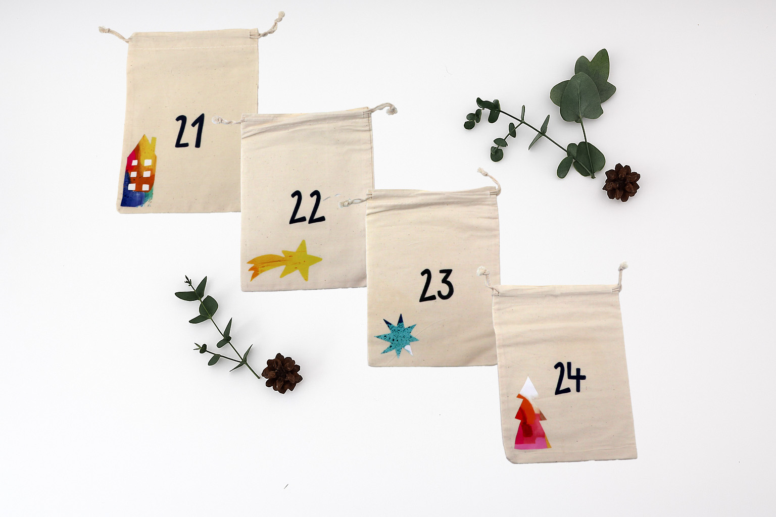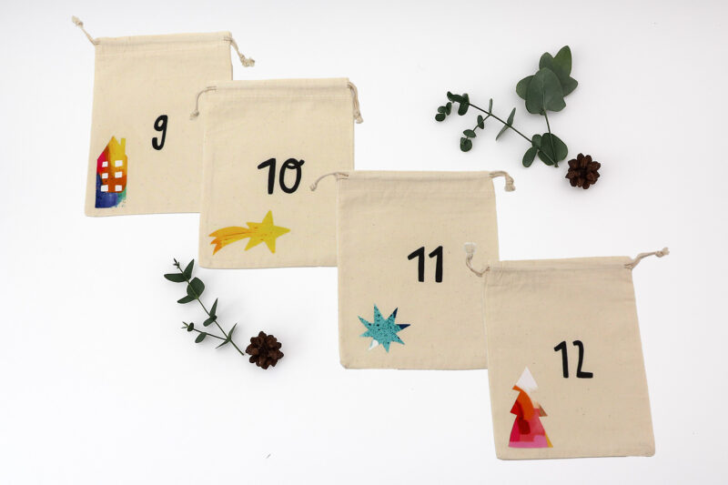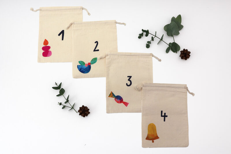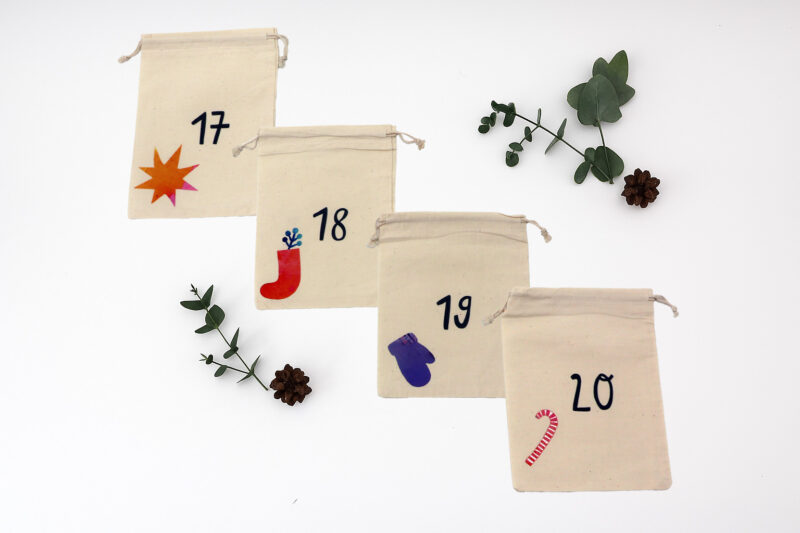 • 24 x personalisierte Säckchen mit Motiv und Zahl