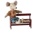 Eine Holzbank, die perfekt zur Mäusefamilie passt. Die hölzerne Sitzbank hat einen schönen handgemalten Vintage Look und eine weiche Sitzauflage – perfekt, um sich vor richtig gemütlich zu machen.