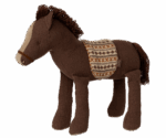 Das braune Pony ist aus einem weichen Baumwoll-Leinen-Stoff gefertigt. Die Mähne und der Schweif bestehen aus Baumwollschnüren und der Sattel ist aus weichem Strickgewebe gefertigt, das eine komfortablen Ritt garantiert.