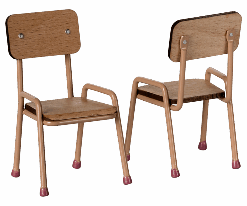 Tisch- und Stuhlset, das zum Mausloch Bauernhaus passt. Er ist aus Buchenholz mit Metallbeinen gefertigt. Bitte beachte die handgefertigten Farbdetails an den Füßen der Beine – am Tisch als auch an den Stühlen. Das Set wird mit 2 Stühlen geliefert.