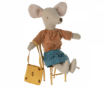 Die Mama Maus von Maileg gestaltet taff ihren Alltag und sorgt für ihre kleinen Mäusekinder. Sie trägt ein gestreiftes Shirt und einen legeren Rock mit Karo-Muster. Ihre niedliche Tasche im Käsescheiben-Look hat sie immer dabei. Schau, die Tasche hat sogar keine Käselöcher!