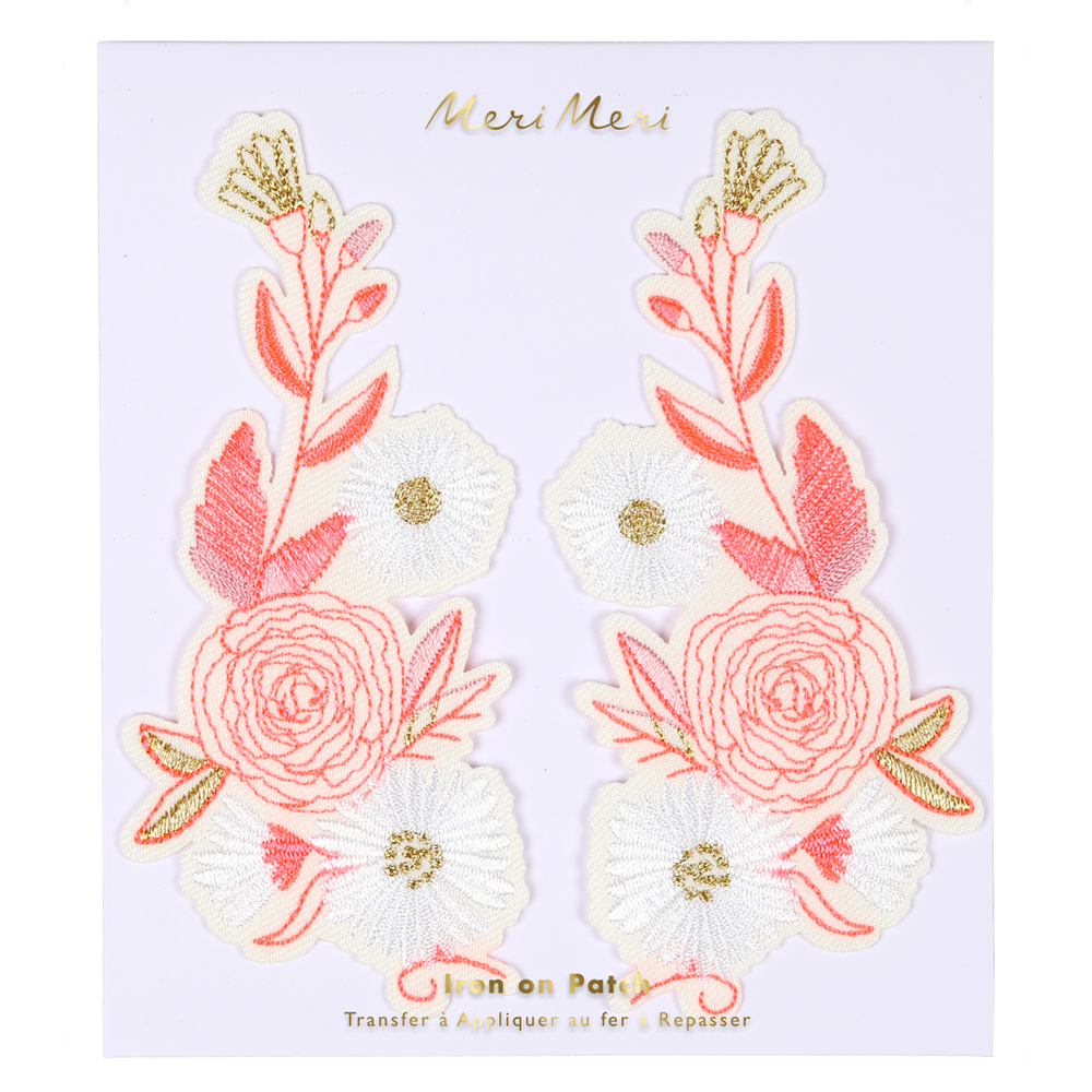 Die Wildblumen-Bügelbilder von Meri Meri  verschönern Pullover, Taschen, Kissen oder andere Sachen. Es kann sehr schwierig sein, Dinge zu finden, die zum eigenen Stil passen. Warum also nicht Kleidung und Accessoires mit einem schönen Patch individuell aufwerten? Diese Packung enthält zwei schöne Wildblumen-Patches, die mit Neon- und Goldfaden-Details bestickt sind.