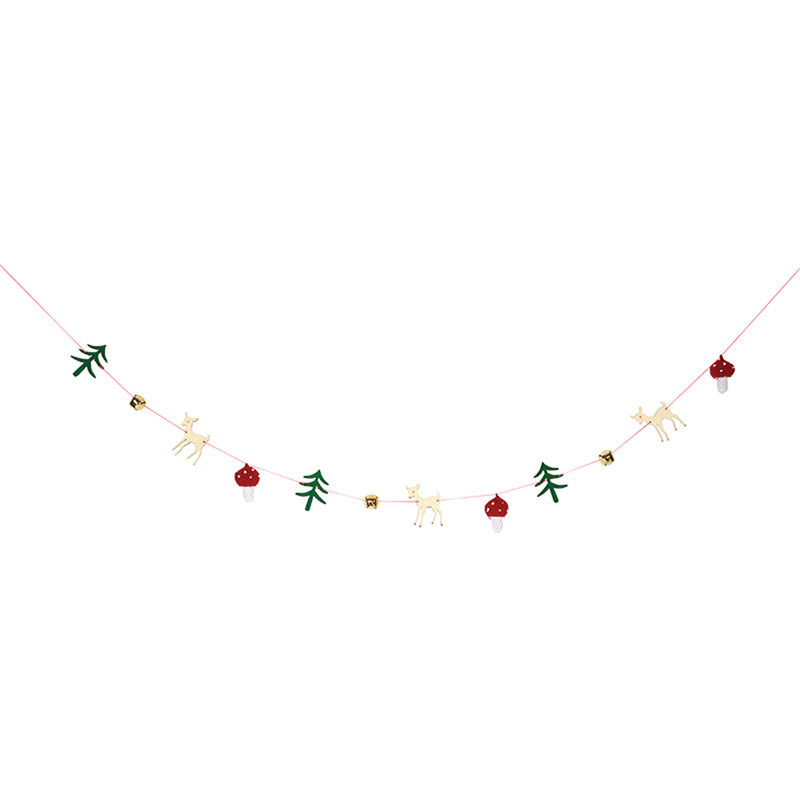Die wunderschön gestalteten Girlande besteht aus Rentieren, Bäumen aus Holz, gestrickte Pilze und Goldglöckchen.
