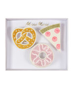 Mit den drei bestickten Broschen ist schnell ein neuer Look kreiert. Mit der Brezeln, Kuchenstück und Donut, die in Neonpink und Gold verziert sind, kann man es sich stilvoll schmecken lassen. Die gestickten Broschen sind aus Baumwoll-Canvas und Filz gefertigt und an einem goldfarbenen Sicherheitsnadelverschluss.