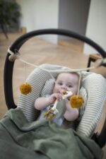 Die Kinderwagenkette von Trixie  ist aus Bio-Baumwolle gefertigt und fördert durch die verschiedenen Elemente auf spielerische Weise die Entwicklung deines Babys. Ob während der Spazierfahrt im Kinderwagen oder in der Babyschale während der Auto- oder Bahnfahrt – sie wird zum ersten ‚Spielgefährten‘ für kleine Entdecker. Die Mobile-Kette lässt sich mit zwei Clips einfach am Kinderwagen oder dem Haltegriff der Babyschale befestigen. Sie dient zur Beruhigung deines Kindes und bringt viele fantasievolle Spiele mit sich.
