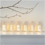 Besonders praktisch: im Dach der Häuser ist ein kleines Loch eingestanzt. Durch dieses Loch kann der beiliegende Faden gefädelt werden, um die Häuser aufzuhängen. Ob als Deko-Objekte oder als süßen Adventskalender (dafür benötigst du den Artikel 4 x) – deiner Kreativität sind keinerlei Grenzen gesetzt.