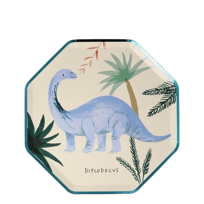 Auf deiner Dinosaurier-Party sind diese brillanten Teller von Meri Meri sicher ein echter Hingucker! Nimm die Partygäste mit zu einem Besuch ins Königreich der Dinosaurier. Jeder Pappteller ist wunderschön illustriert mit einer der bekanntesten Größen – T-Rex, Diplodocus, Spinosaurus, Stego- und Plesiosaurus. Alle verziert mit Kupfer- und Grünfoliendetails. Roaarrrrr, let the fun begin!