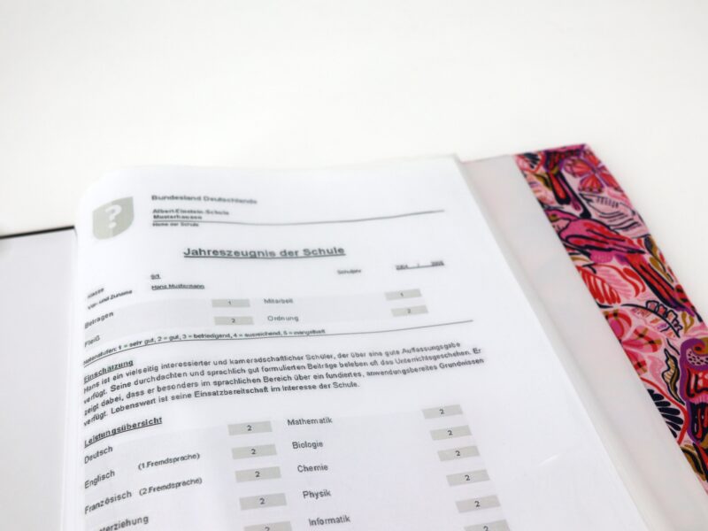 Unsere Zeugnismappen kommen mit einem Sichtbuch im A4-Format. Das Sichtbuch enthält 30 Folien. So sind Zeugnisse, Urkunden, Notenblätter oder die gesammelten Kunstwerke Deines Kindes bestens aufgehoben und können dank des einzigartigen Einbandes noch ein wenig stolzer präsentiert werden!