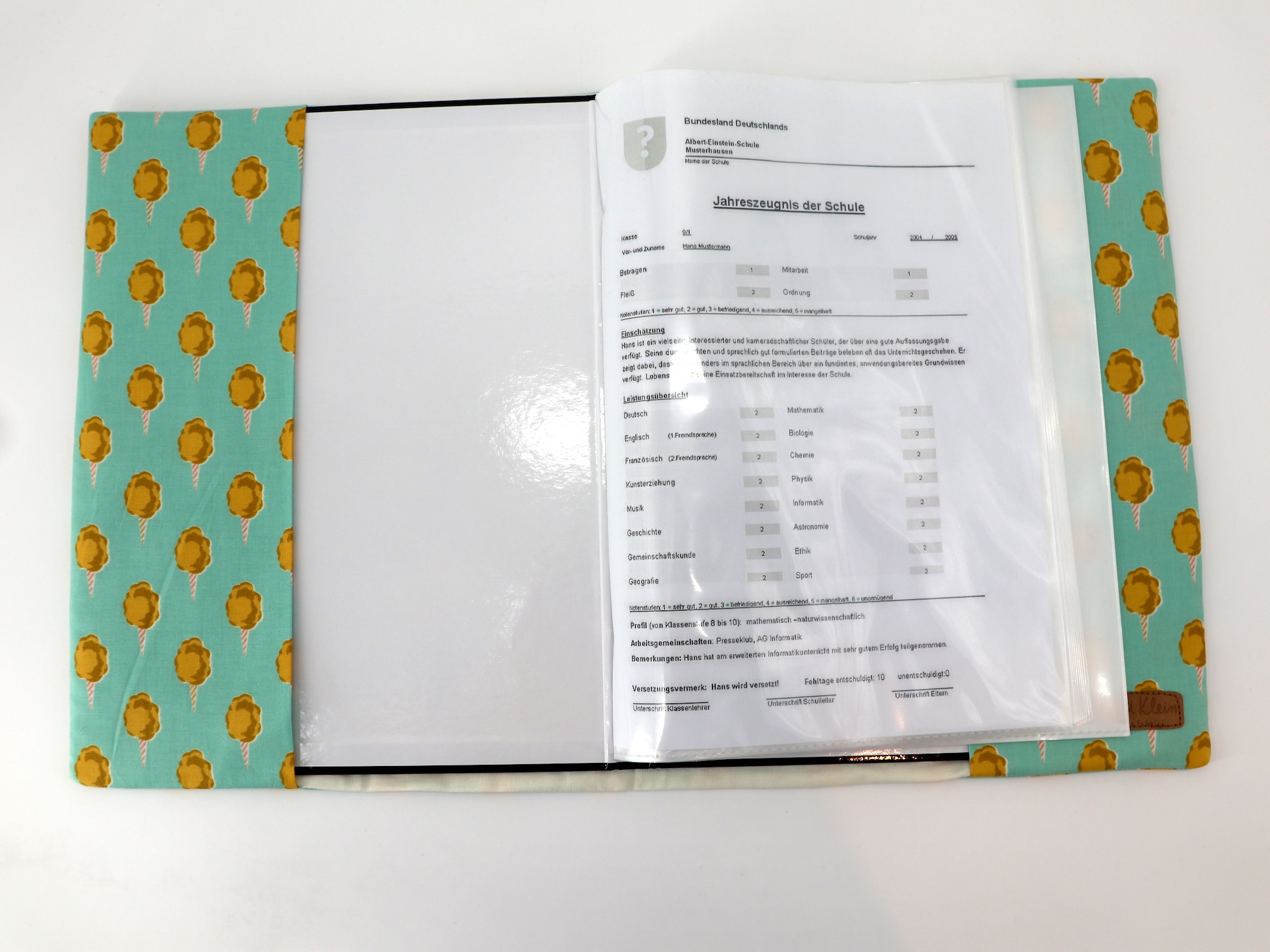 Unsere Zeugnismappen kommen mit einem Sichtbuch im A4-Format. Das Sichtbuch enthält 30 Folien. So sind Zeugnisse, Urkunden, Notenblätter oder die gesammelten Kunstwerke Deines Kindes bestens aufgehoben und können dank des einzigartigen Einbandes noch ein wenig stolzer präsentiert werden!