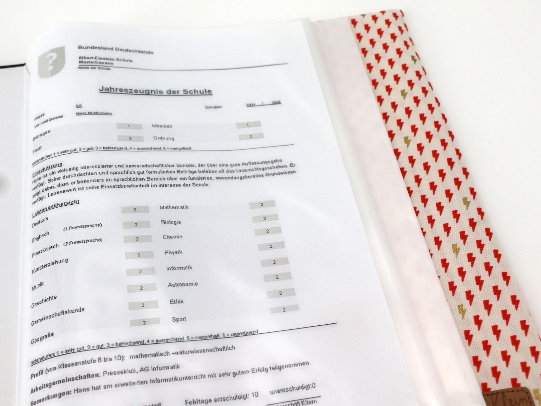 Unsere Zeugnismappen kommen mit einem Sichtbuch im A4-Format. Das Sichtbuch enthält 30 Folien. So sind Zeugnisse, Urkunden, Notenblätter oder die gesammelten Kunstwerke Deines Kindes bestens aufgehoben und können dank des einzigartigen Einbandes noch ein wenig stolzer präsentiert werden!