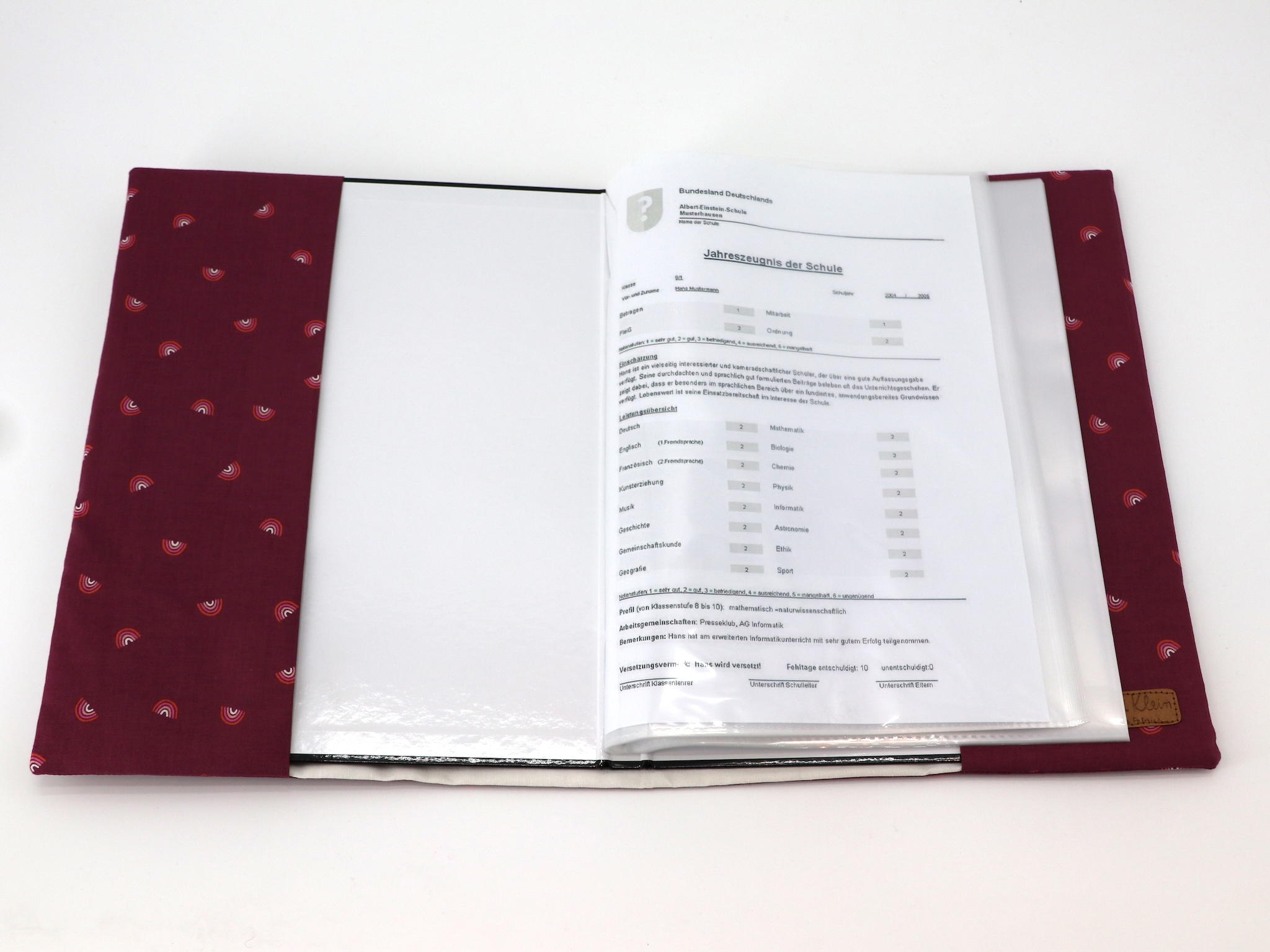Unsere Zeugnismappen kommen mit einem Sichtbuch im A4-Format. Das Sichtbuch enthält 30 Folien. So sind Zeugnisse, Urkunden, Notenblätter oder die gesammelten Kunstwerke Deines Kindes bestens aufgehoben und können dank des einzigartigen Einbandes noch ein wenig stolzer präsentiert werden!