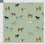 Bei soviel Pferdestärke schlagen hier sicher so manche Herzen höher. Sarah vom Label Gretas Shwester hat diese fröhliche Wiese voller wiehender Vierbeiner illustriert – mit kleinen Blümchen und Herzen lieblich aufgefrischt
