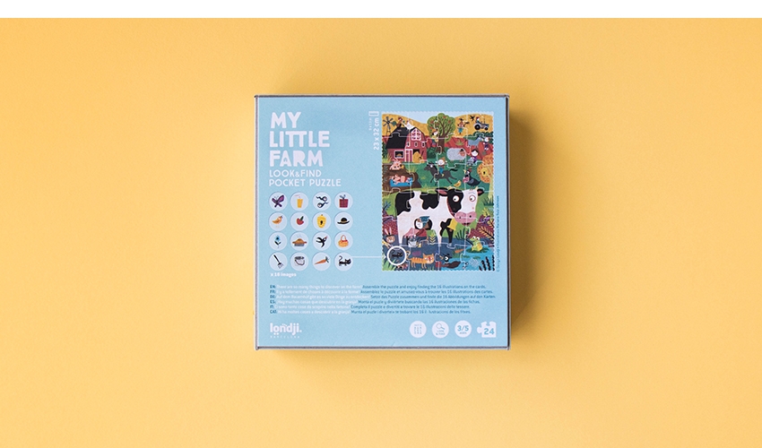 Spaß auf dem Bauernhof! Der Sommer ist da und da gibt es bei Londji auf dem Bauernhof jede Menge zu entdecken! Die kleinen Schweine baden und sonnen sich, das Schaf entledigt sich seiner Wolle, die Hühner erzählen den kleinen Vögeln Geschichten und die Kuh freut sich, dass sie so viele Freunde um sich hat. Ein 24-teiliges Puzzle und jetzt auch als Beobachtungsspiel im praktischen Taschenformat – damit du es überall spielen kannst!