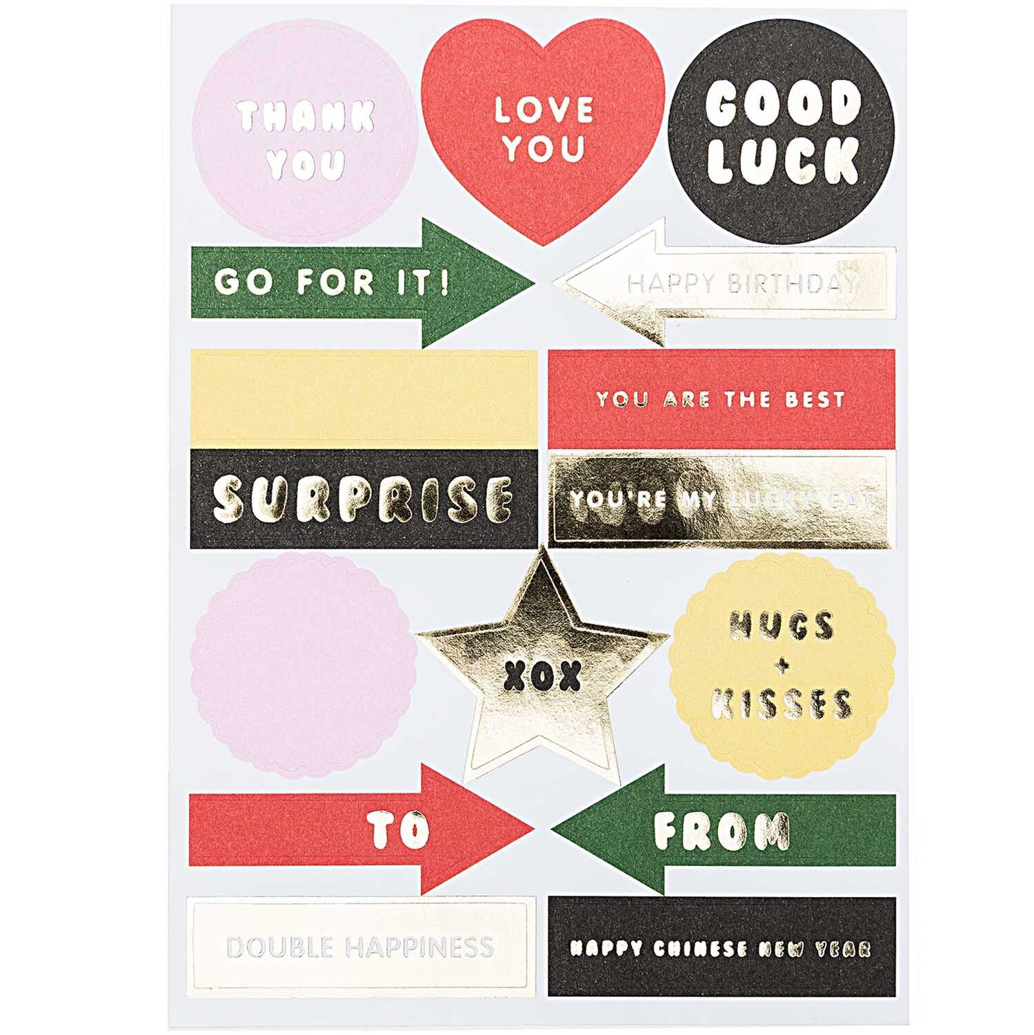 Mit den Aufklebern lässt sich die Karte, aber auch der Umschlag verzieren. Die Karten sind mit Neon- und Folieneffekten veredelt.