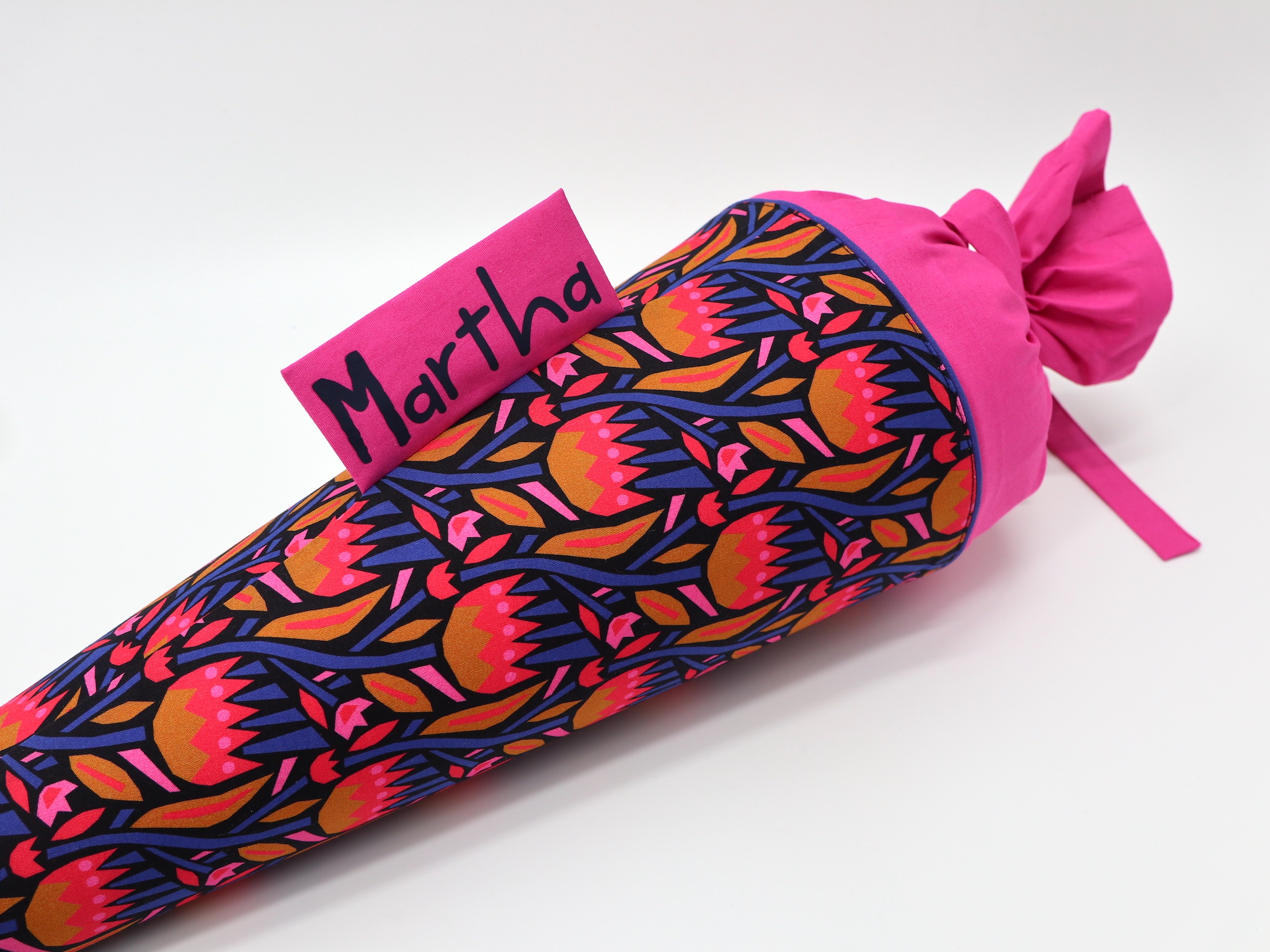 Wir nähen die passende Zeugnismappe in dem Stoff des Tütenkörpers. Hier gibt es nähere Details.
