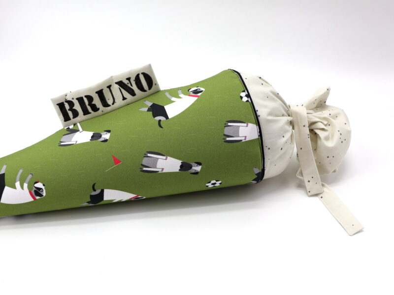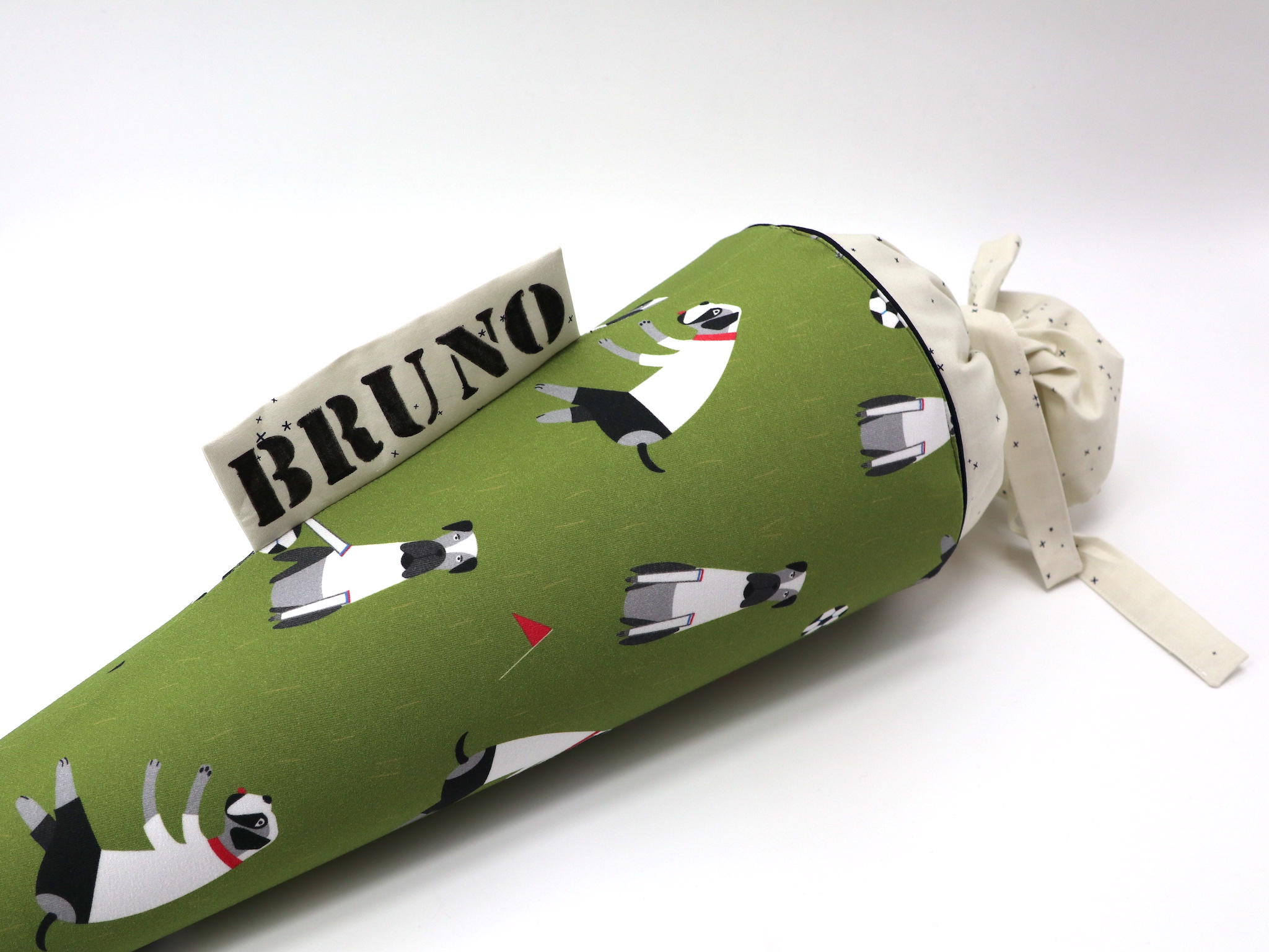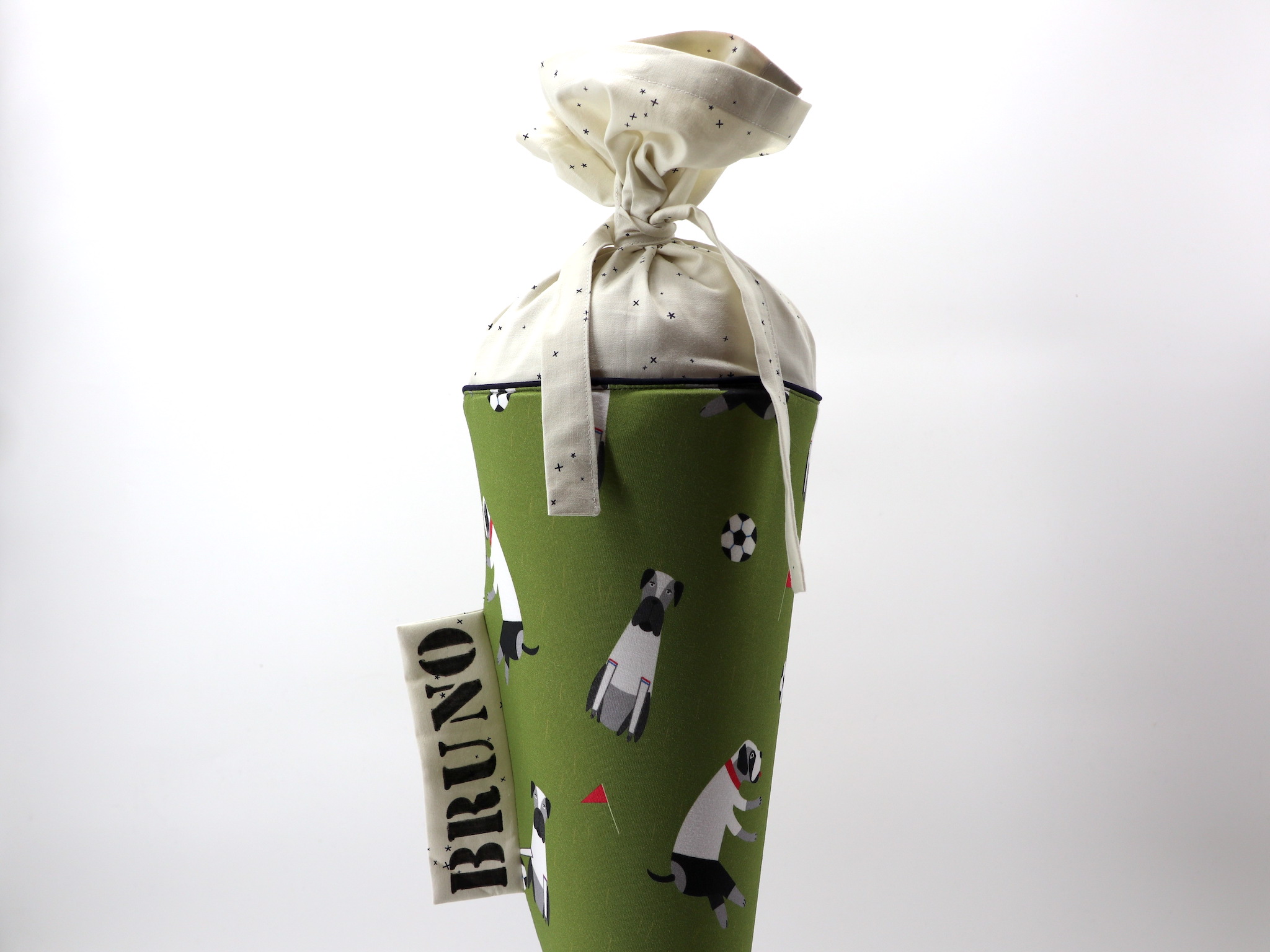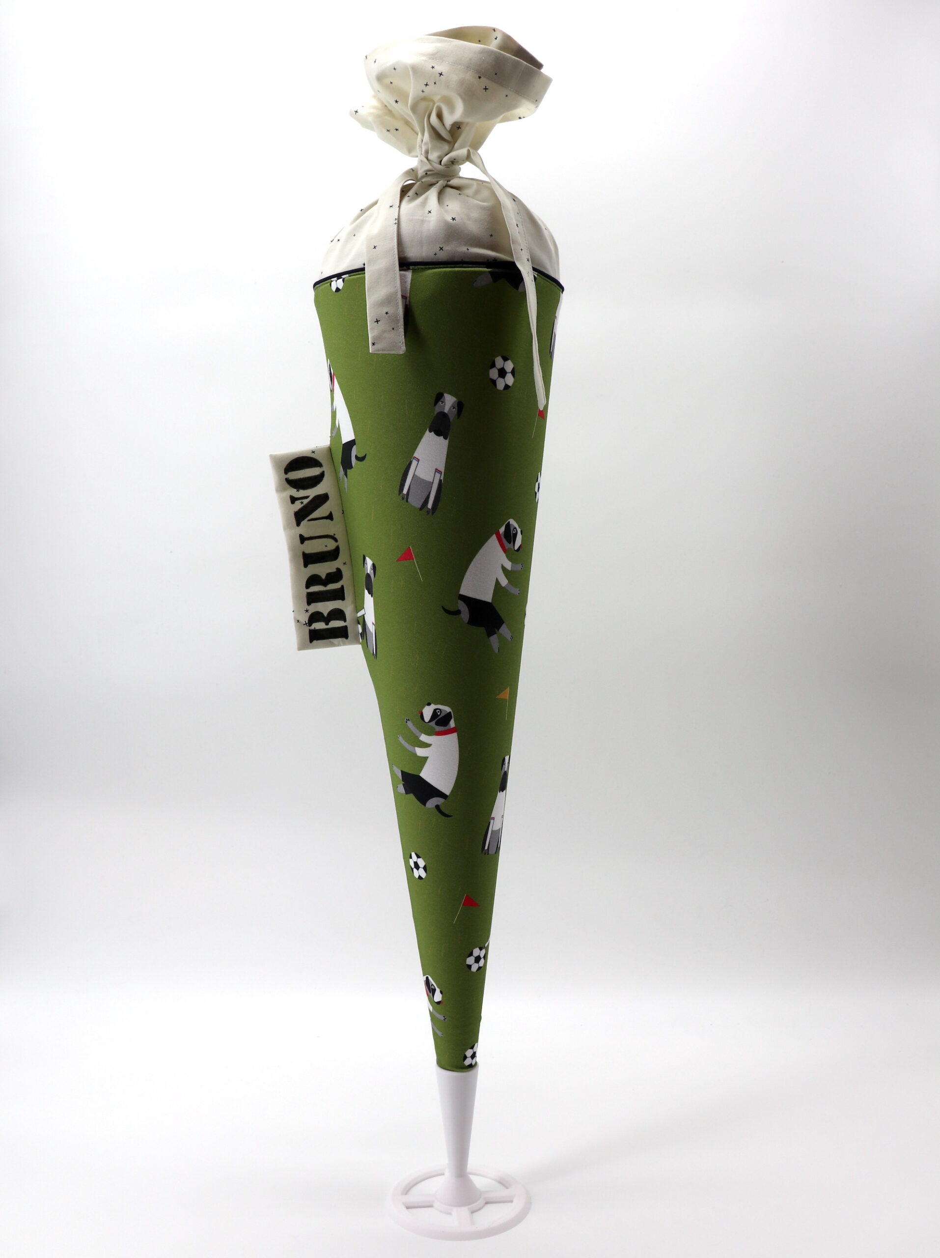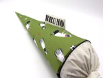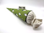 Die Schultüte wird aus hochwertigen Designerstoffen genäht und auf Wunsch mit dem Namen des Schulkindes individualisiert. Die Tüte ist 70cm hoch und wird mit einem entsprechenden Papprohling geliefert. Um eine bleibende Erinnerung an den Einschulungstag zu haben, kann nach der Einschulung der Papprohling aus der Schultüte entfernt werden und und mit dem Inlet als Kuschelkissen Einzug in das Kinderzimmer halten.