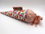 Die Schultüte wird aus hochwertigen Designerstoffen genäht und auf Wunsch mit dem Namen des Schulkindes individualisiert. Die Tüte ist 70cm hoch und wird mit einem entsprechenden Papprohling geliefert. Um eine bleibende Erinnerung an den Einschulungstag zu haben, kann nach der Einschulung der Papprohling aus der Schultüte entfernt werden und und mit dem Inlet als Kuschelkissen Einzug in das Kinderzimmer halten.