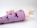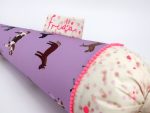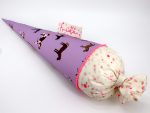 Die Schultüte wird aus hochwertigen Designerstoffen genäht und auf Wunsch mit dem Namen des Schulkindes individualisiert. Die Tüte wird mit einem entsprechenden Papprohling geliefert. Um eine bleibende Erinnerung an den Einschulungstag zu haben, kann nach der Einschulung der Papprohling aus der Schultüte entfernt werden und und mit dem Inlet als Kuschelkissen Einzug in das Kinderzimmer halten.