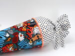 Die Schultüte wird aus hochwertigen Designerstoffen genäht und auf Wunsch mit dem Namen des Schulkindes individualisiert. Die Tüte ist 70cm hoch und wird mit einem entsprechenden Papprohling geliefert. Um eine bleibende Erinnerung an den Einschulungstag zu haben, kann nach der Einschulung der Papprohling aus der Schultüte entfernt werden und und mit dem Inlet als Kuschelkissen Einzug in das Kinderzimmer halten.