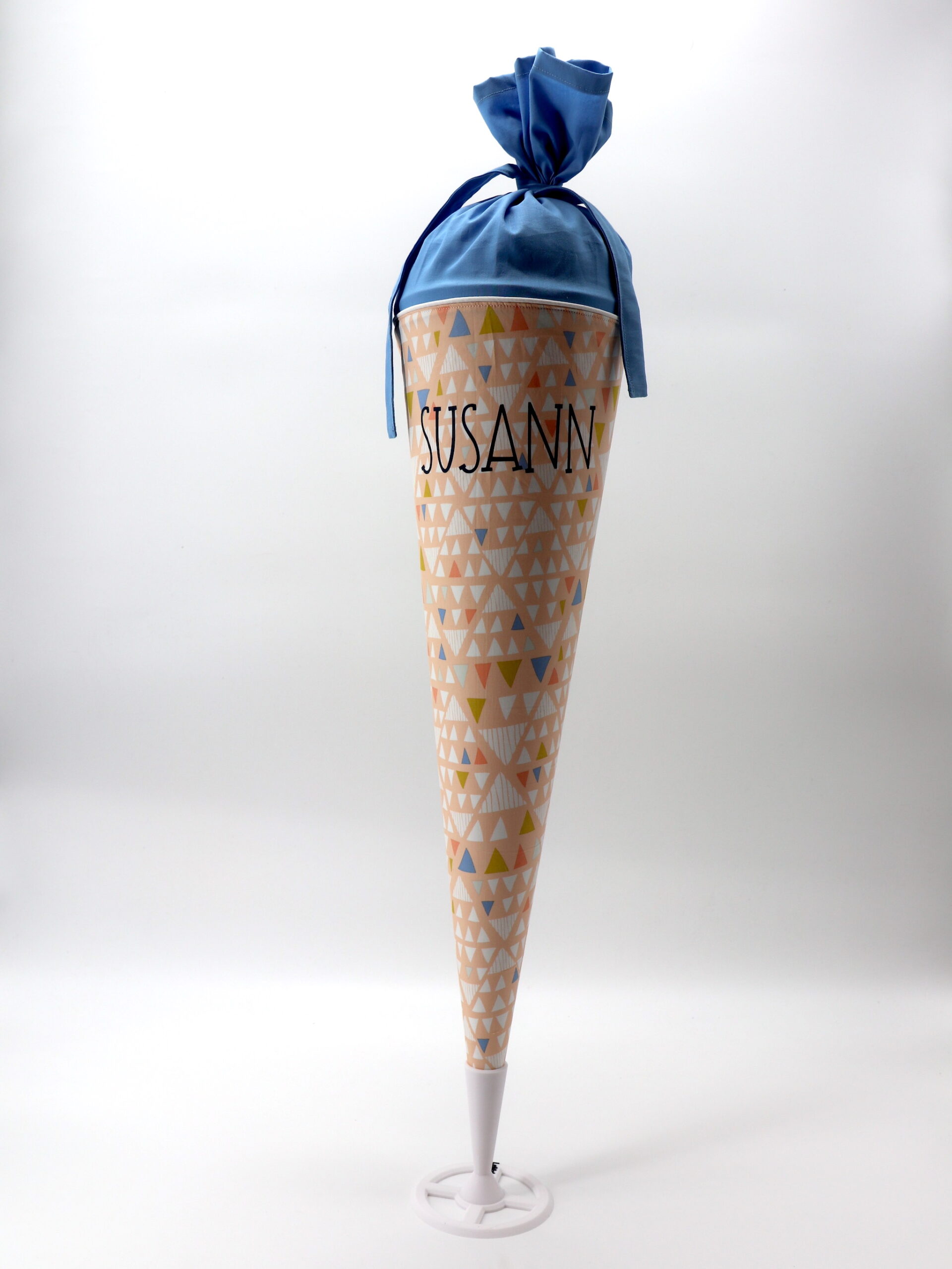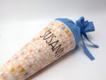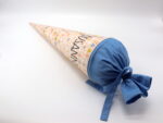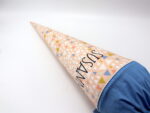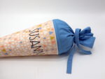 Die Schultüte wird aus hochwertigen Designerstoffen genäht und auf Wunsch mit dem Namen des Schulkindes individualisiert. Die Tüte ist 70cm hoch und wird mit einem entsprechenden Papprohling geliefert. Um eine bleibende Erinnerung an den Einschulungstag zu haben, kann nach der Einschulung der Papprohling aus der Schultüte entfernt werden und und mit dem Inlet als Kuschelkissen Einzug in das Kinderzimmer halten.