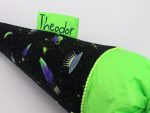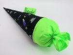 Die Schultüte wird aus hochwertigen Designerstoffen genäht und auf Wunsch mit dem Namen des Schulkindes individualisiert. Die Tüte wird mit einem entsprechenden Papprohling geliefert. Um eine bleibende Erinnerung an den Einschulungstag zu haben, kann nach der Einschulung der Papprohling aus der Schultüte entfernt werden und und mit dem Inlet als Kuschelkissen Einzug in das Kinderzimmer halten.