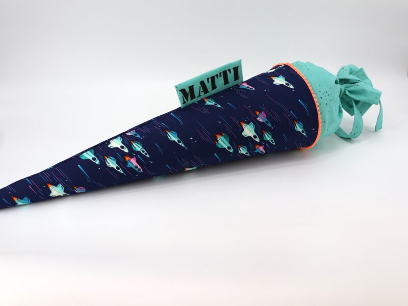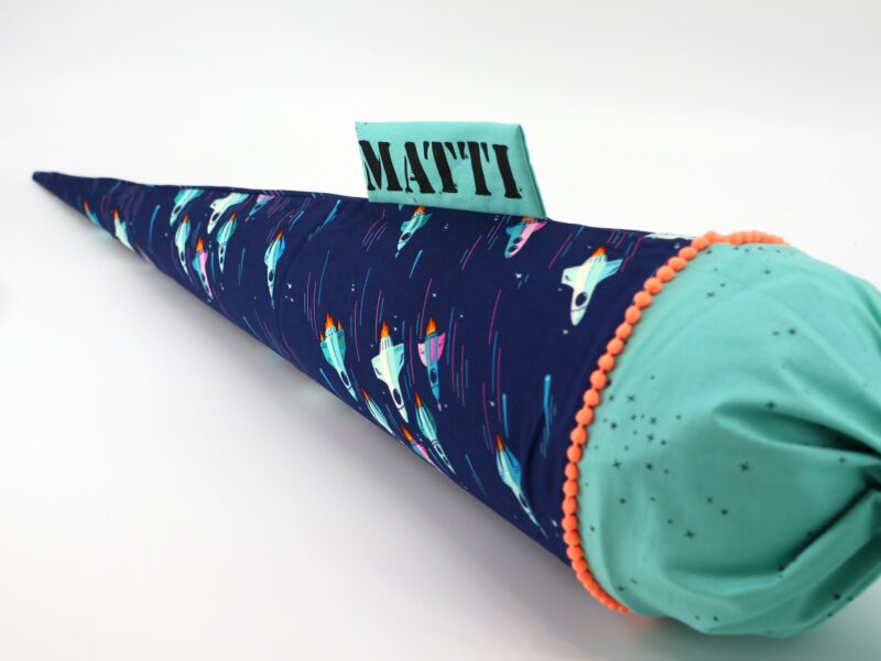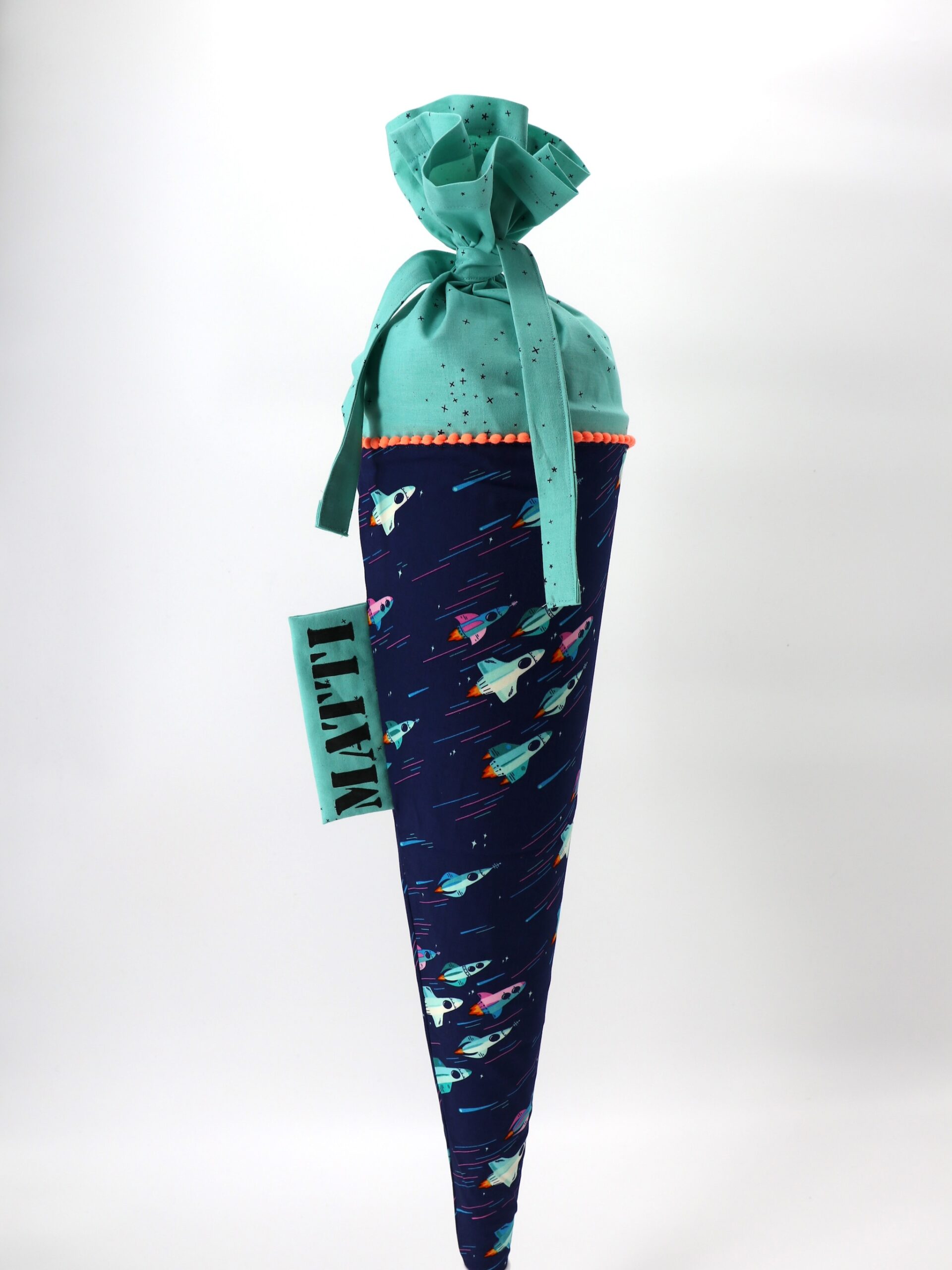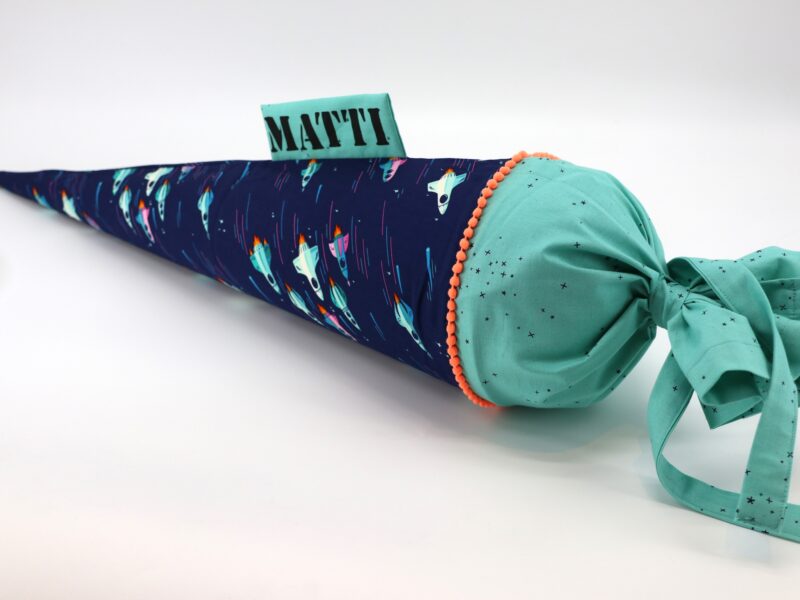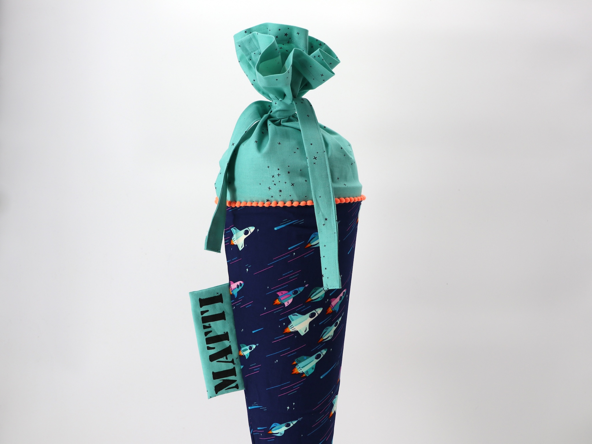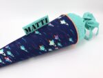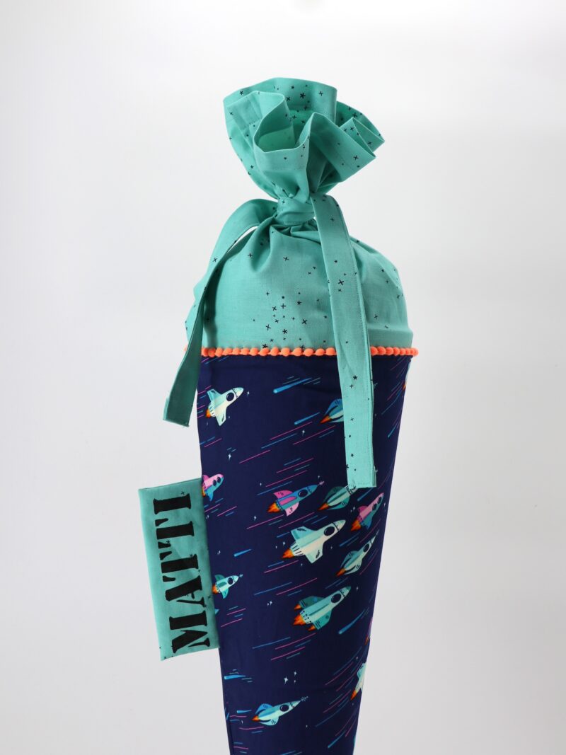 Die Schultüte wird aus hochwertigen Designerstoffen genäht und auf Wunsch mit dem Namen des Schulkindes individualisiert. Die Tüte ist 70cm hoch und wird mit einem entsprechenden Papprohling geliefert. Um eine bleibende Erinnerung an den Einschulungstag zu haben, kann nach der Einschulung der Papprohling aus der Schultüte entfernt werden und und mit dem Inlet als Kuschelkissen Einzug in das Kinderzimmer halten.