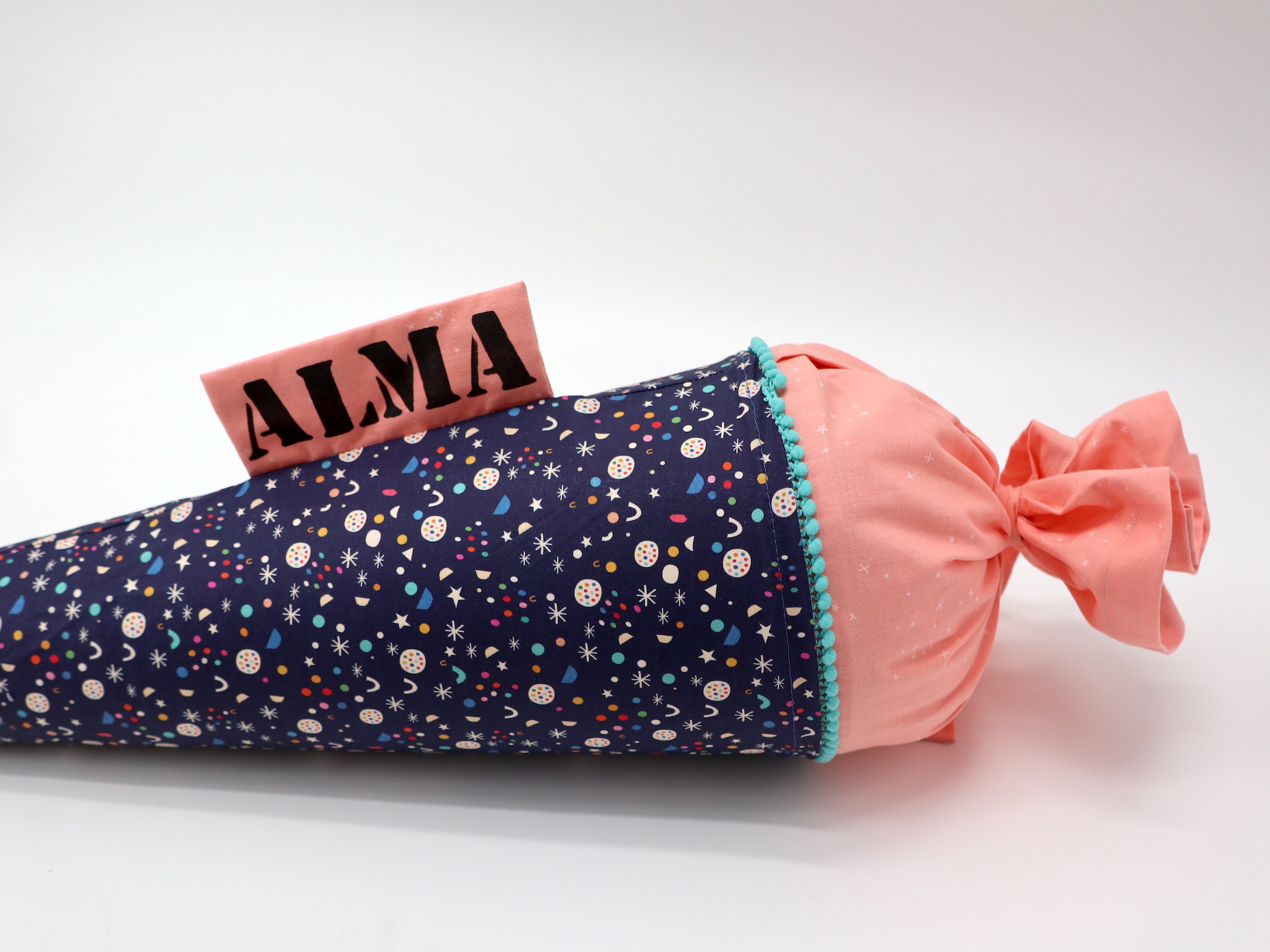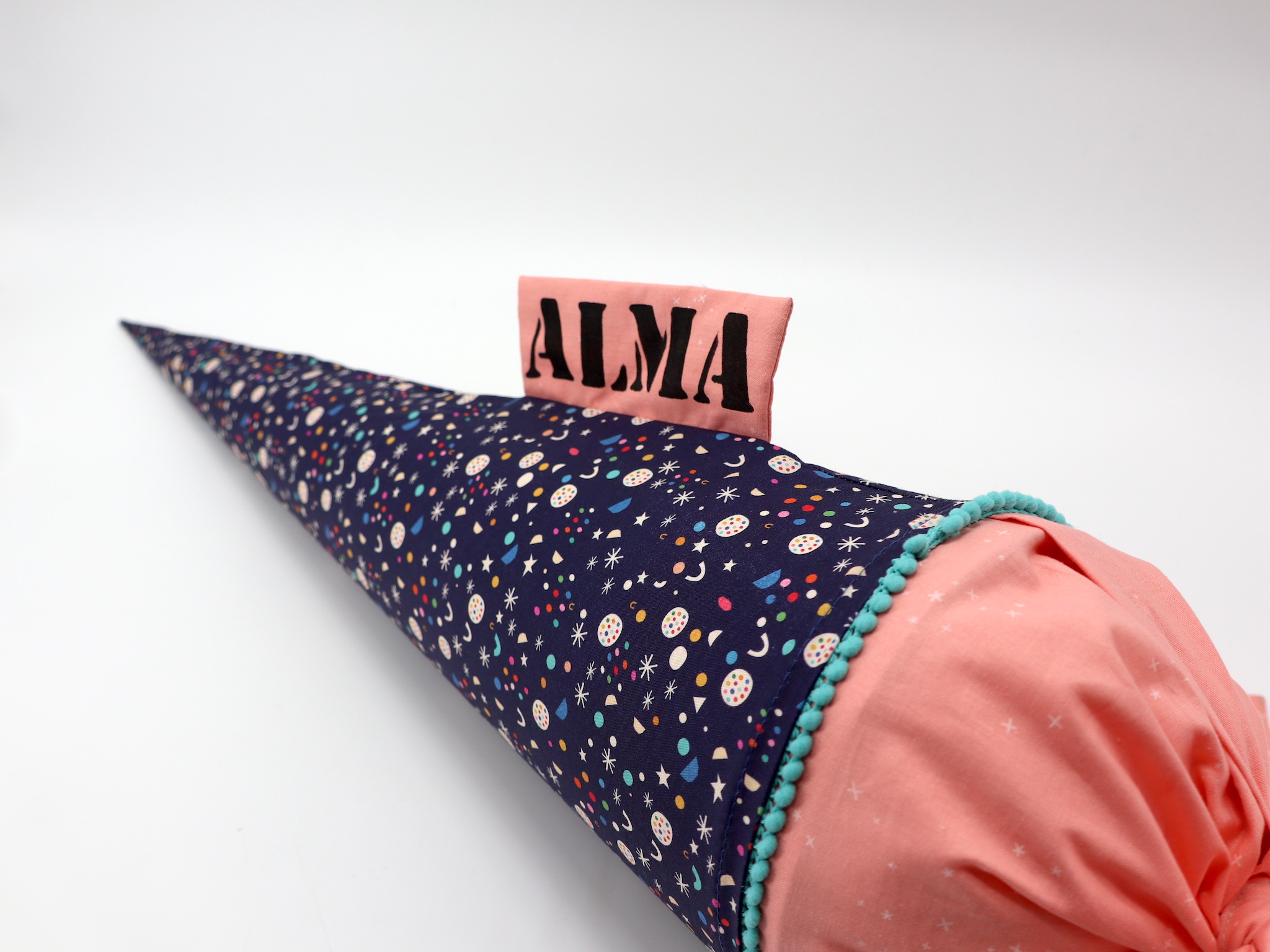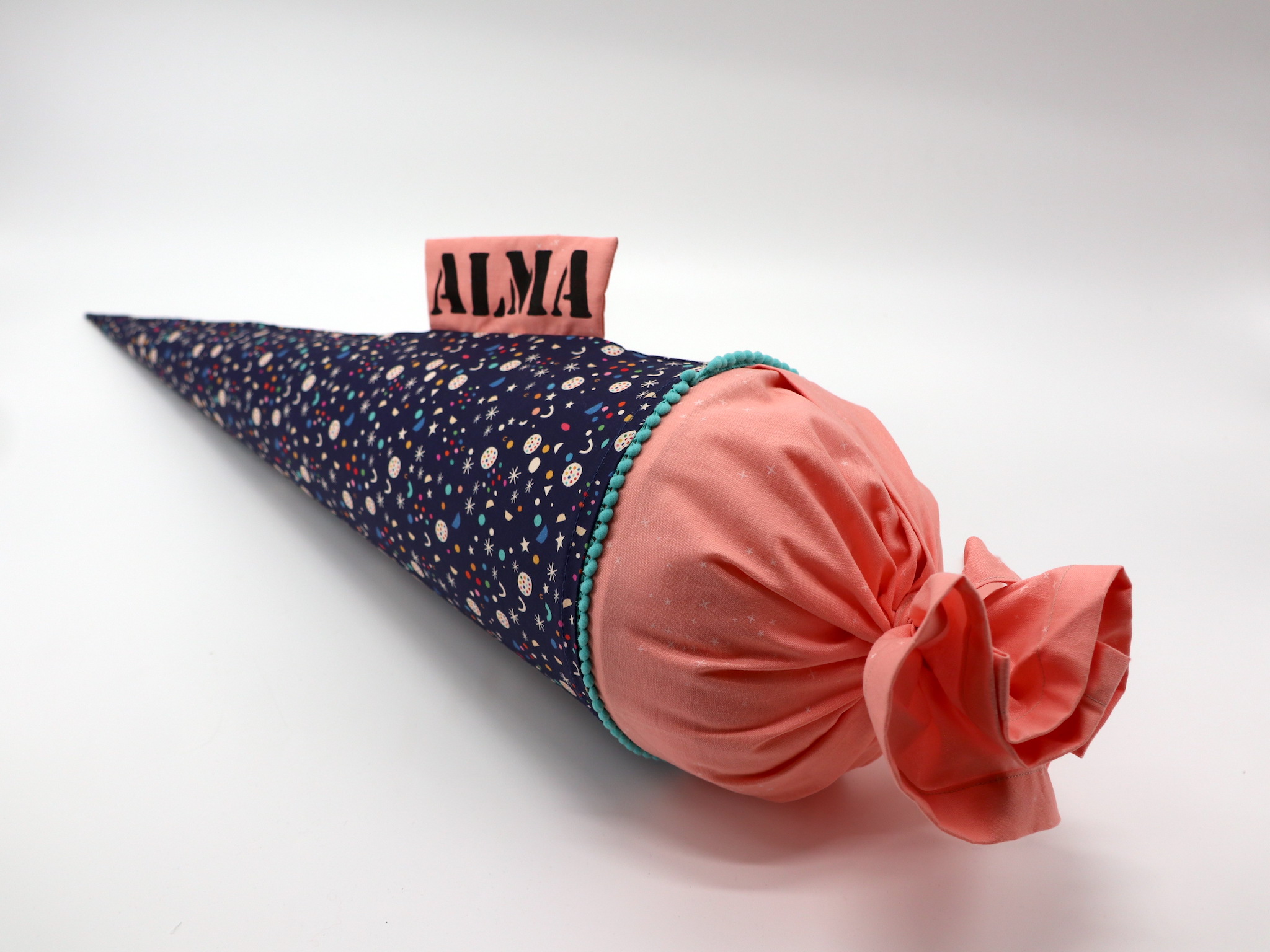 Die Schultüte wird aus hochwertigen Designerstoffen genäht und auf Wunsch mit dem Namen des Schulkindes individualisiert. Die Tüte ist 70cm hoch und wird mit einem entsprechenden Papprohling geliefert. Um eine bleibende Erinnerung an den Einschulungstag zu haben, kann nach der Einschulung der Papprohling aus der Schultüte entfernt werden und und mit dem Inlet als Kuschelkissen Einzug in das Kinderzimmer halten.