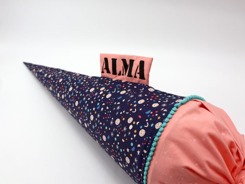 Wir nähen die passende Zeugnismappe in dem Stoff des Tütenkörpers. Hier gibt es nähere Details.