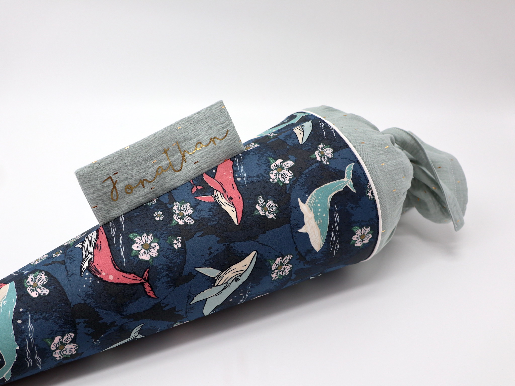 Die Schultüte wird aus hochwertigen Designerstoffen genäht und auf Wunsch mit dem Namen des Schulkindes individualisiert. Die Tüte ist 70cm hoch und wird mit einem entsprechenden Papprohling geliefert. Um eine bleibende Erinnerung an den Einschulungstag zu haben, kann nach der Einschulung der Papprohling aus der Schultüte entfernt werden und und mit dem Inlet als Kuschelkissen Einzug in das Kinderzimmer halten.