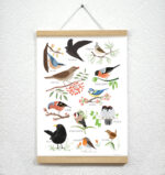 Das bunt illustrierte Poster von Vierundfünfzig Illustration zeigt 12 typische Gartenvögel – Mauersegler, Haubenmeise, Kleiber, Singdrossel, Gimpel, Blaumeise, Buchfink, Feldsperling, Amsel, Stieglitz, Rotkehlchen, Zaunkönig. Eine schöne Wanddekoration für Flur, Wohnzimmer oder Gartenlaube.