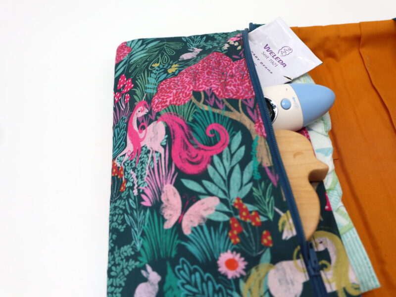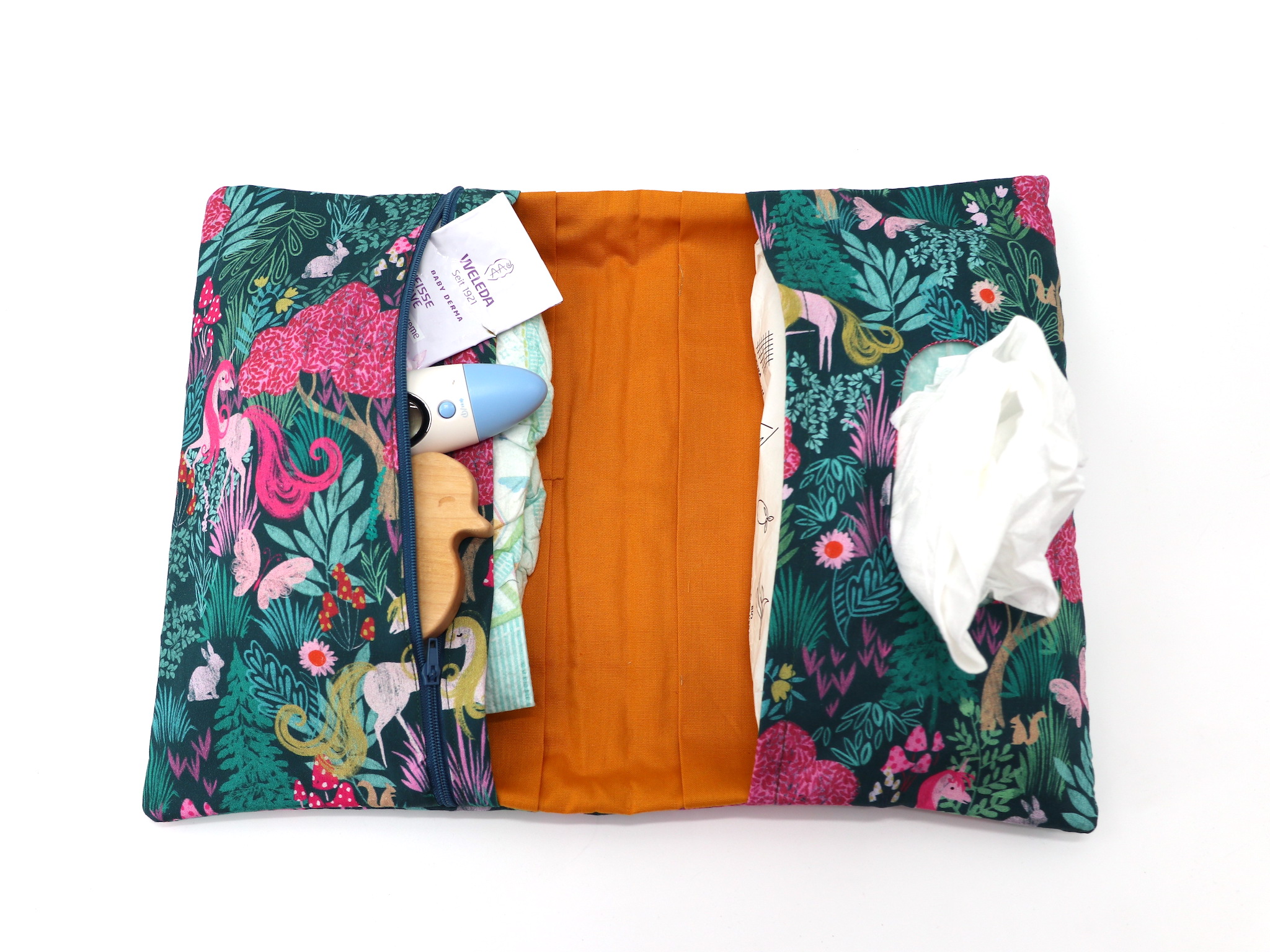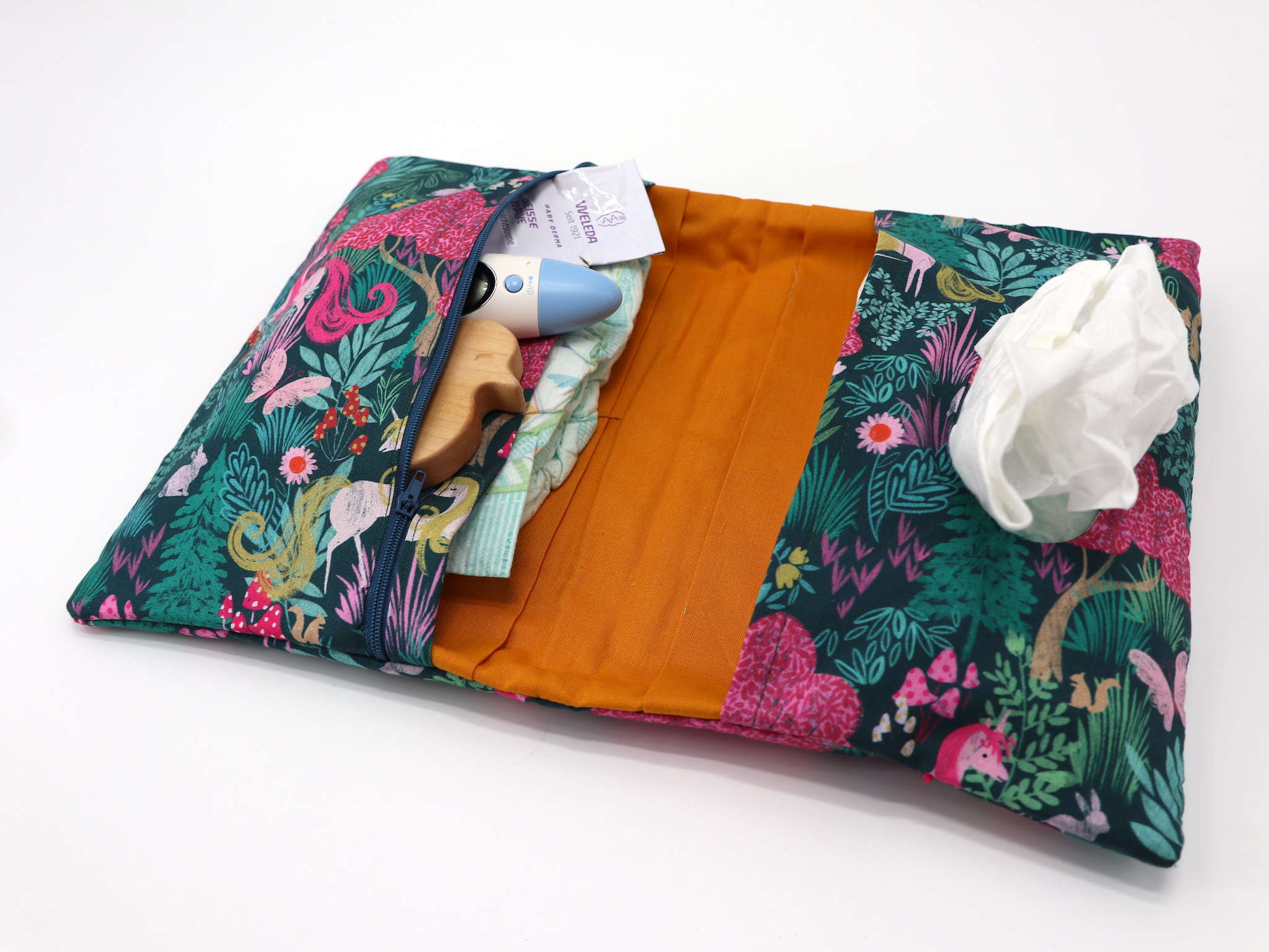 Unsere Windeltasche mit sieben Fächern für Alles was man im Alltag mit dem Baby braucht. Sie ist 26x28cm (aufgeklappt) groß.