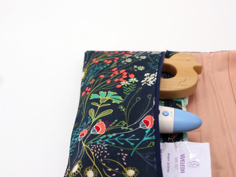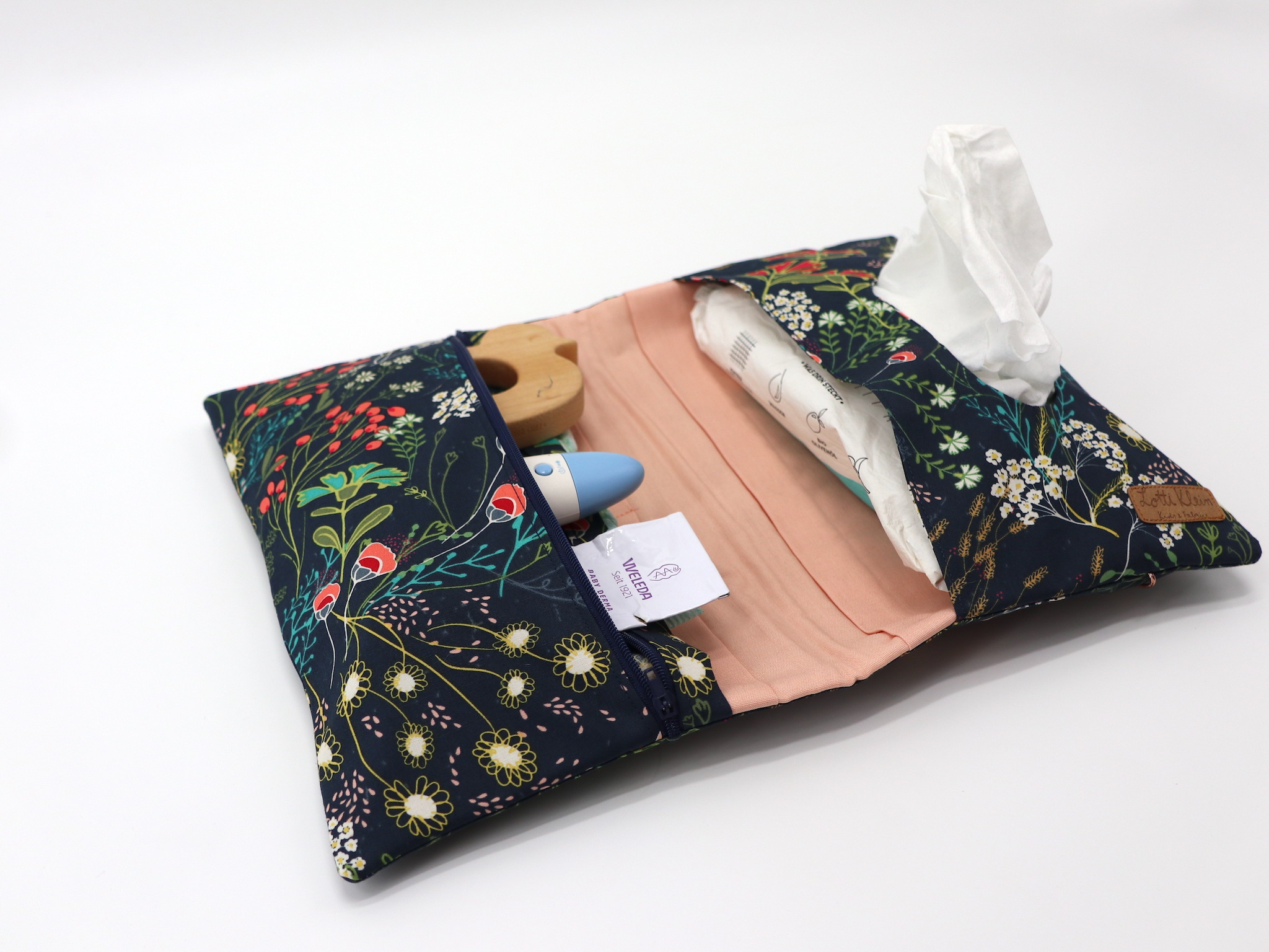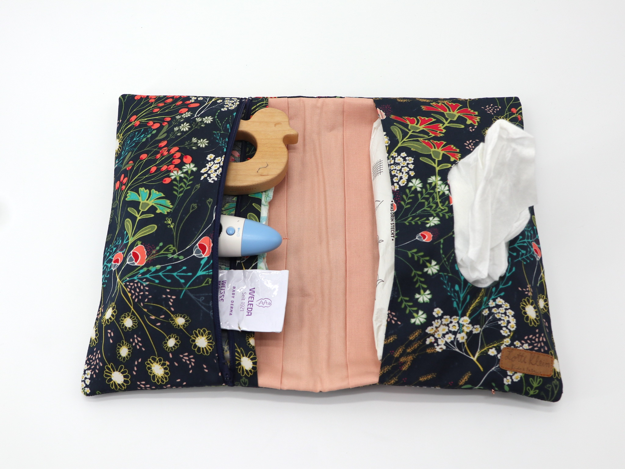 Unsere Windeltasche mit sieben Fächern für Alles was man im Alltag mit dem Baby braucht. Sie ist 26x28cm (aufgeklappt) groß.