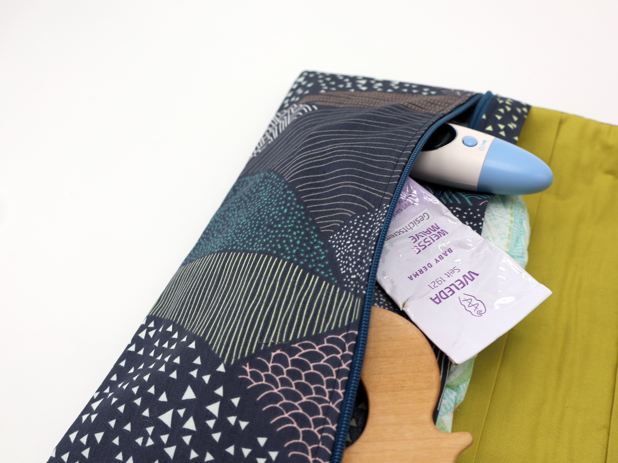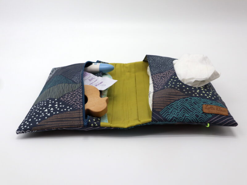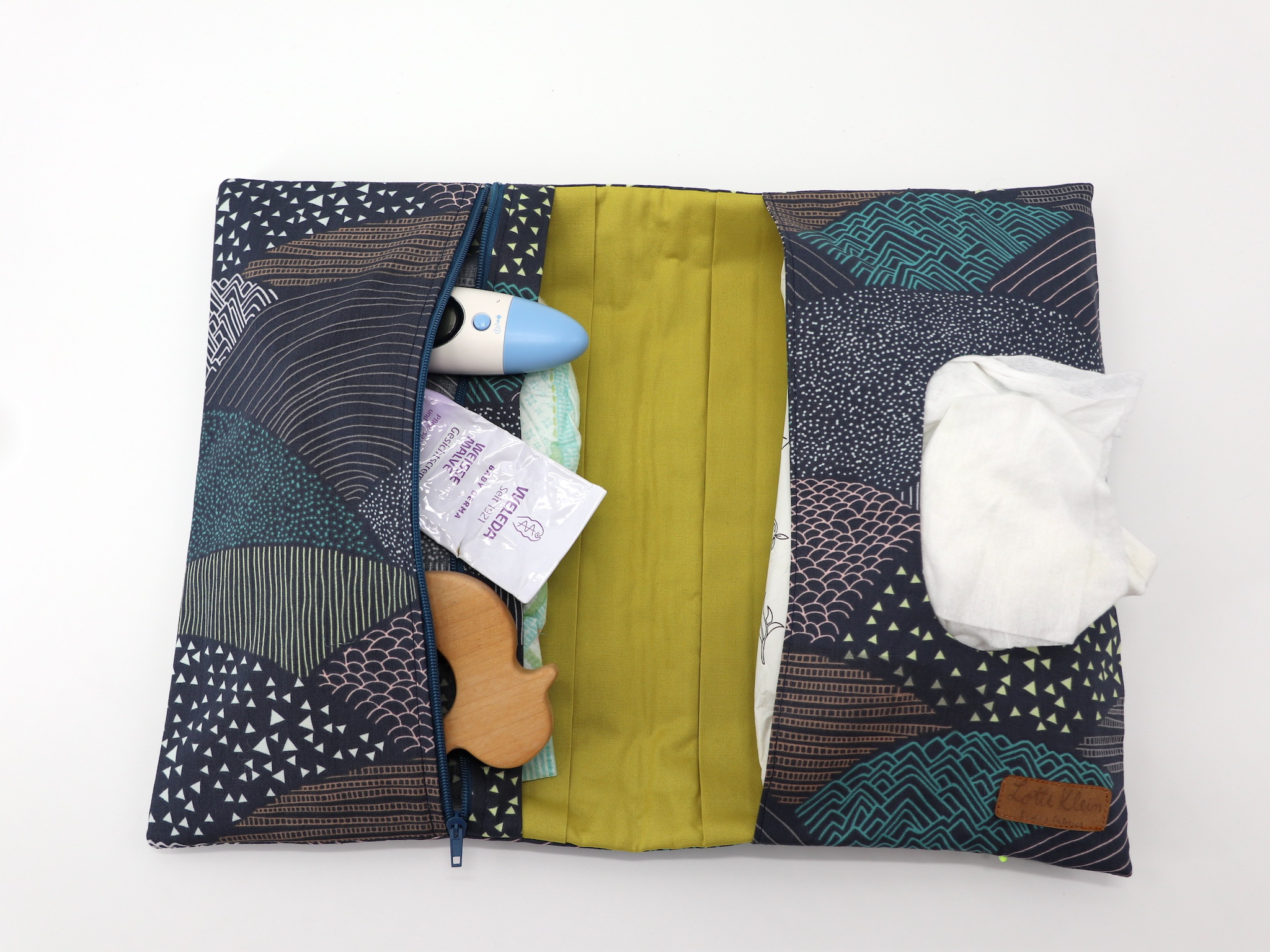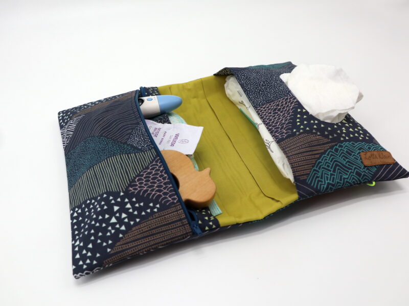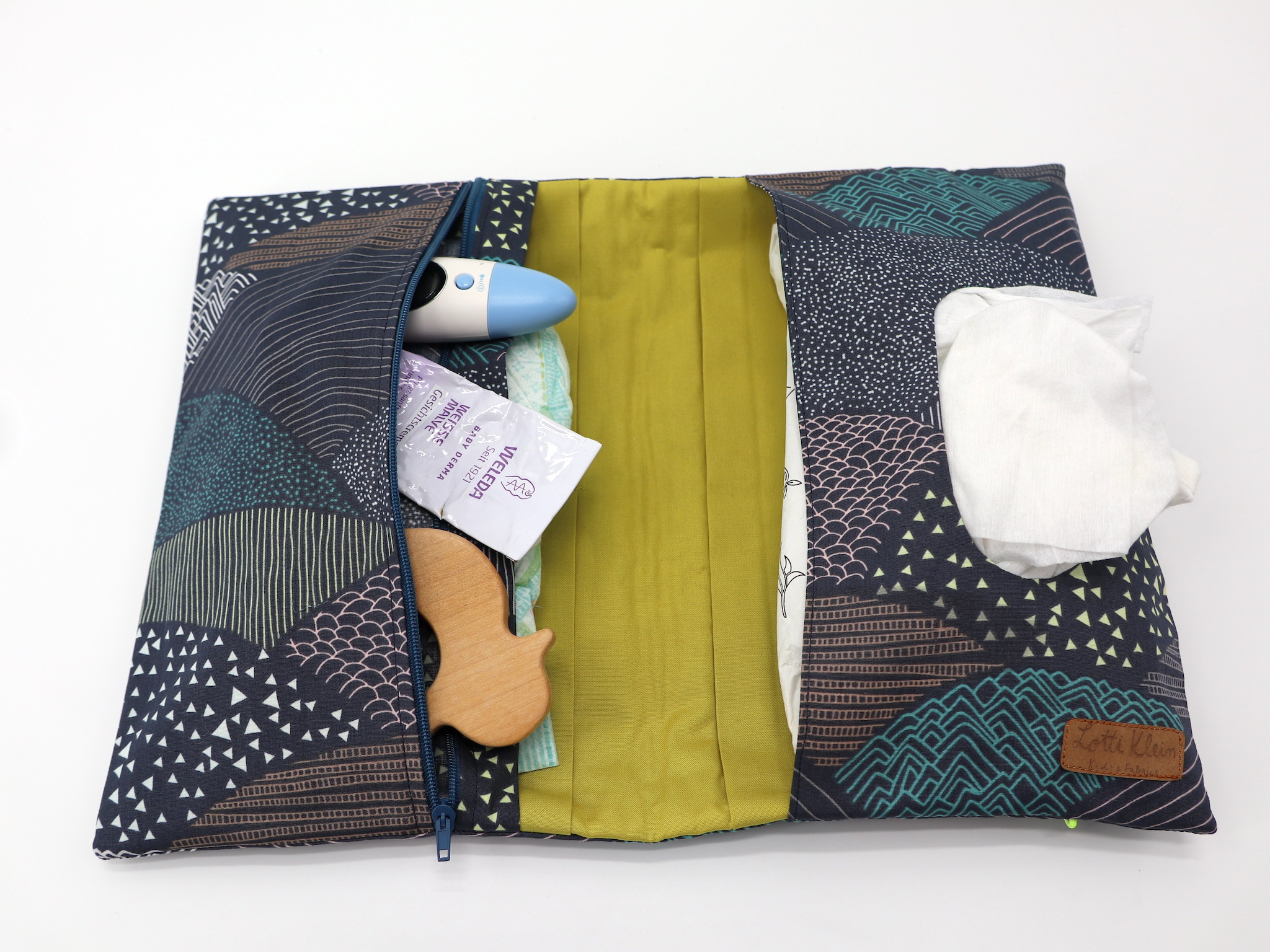 Unsere Windeltasche mit sieben Fächern für Alles was man im Alltag mit dem Baby braucht. Sie ist 26x28cm (aufgeklappt) groß.