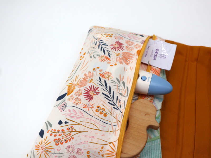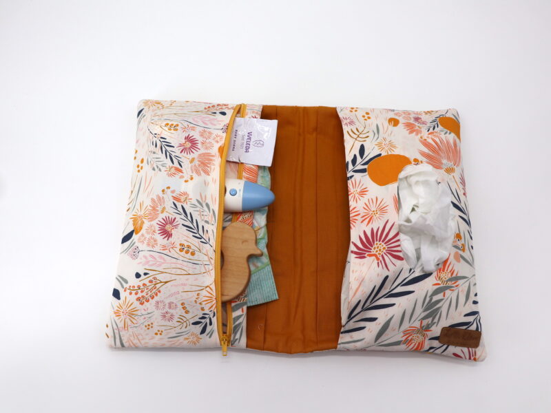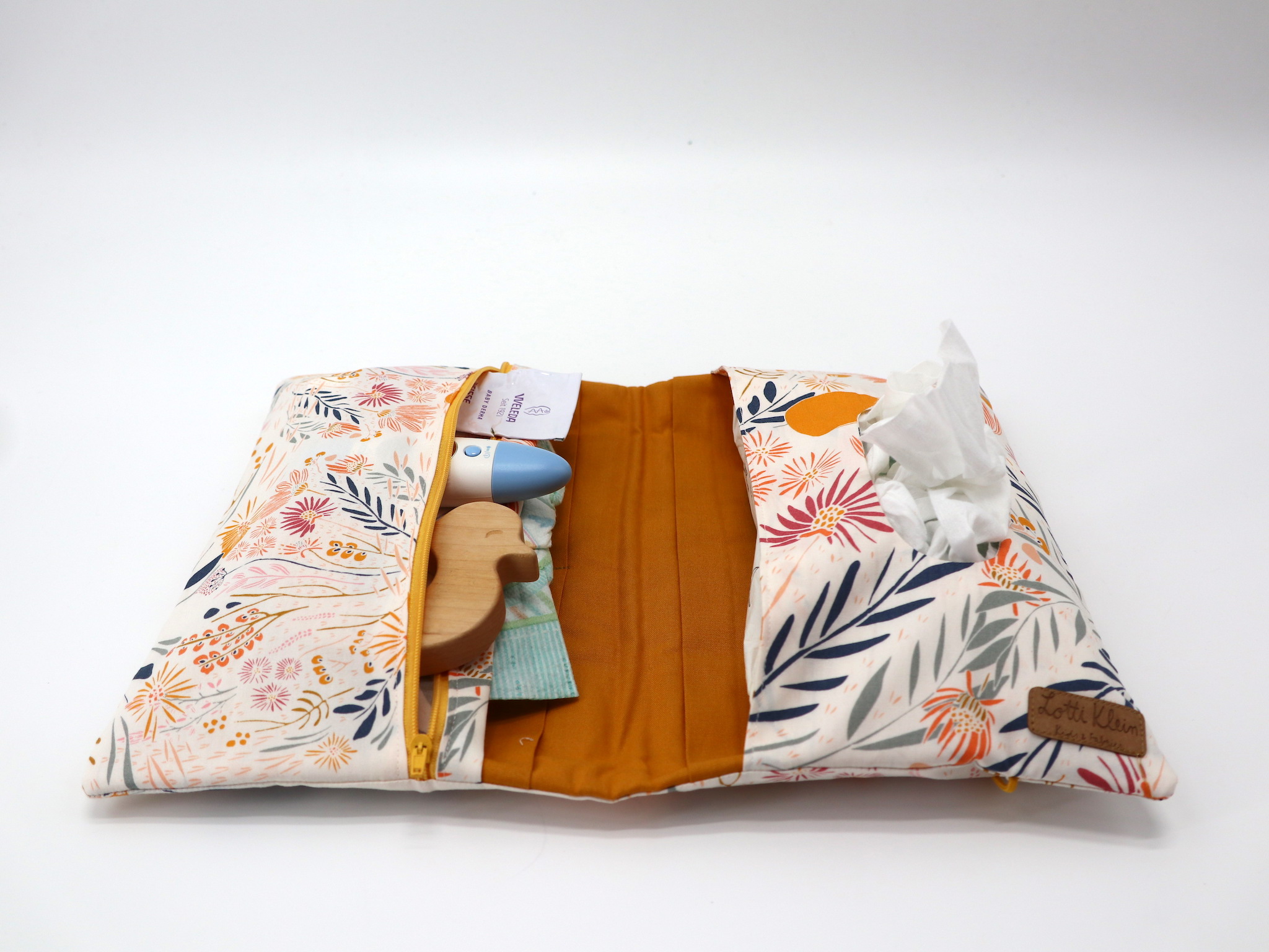 Unsere Windeltasche mit sieben Fächern für Alles was man im Alltag mit dem Baby braucht. Sie ist 26x28cm (aufgeklappt) groß.