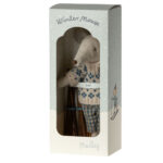 Jedes Set enthält eine Maus, die mit einem warmen Strickpullover, einer Hose und einem Paar Ski und Stöcken bekleidet ist. Ein lustiges Detail sind die Ohren die aussehen, als würde die Maus Ohrenwärmer tragen.